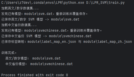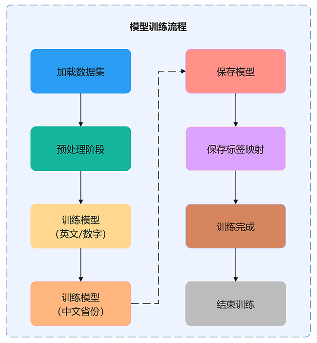 模型训练通过使用标注数据调整参数,使模型能准确预测。本程序使用支持向量机(SVM)进行分类,训练前对图像进行去倾斜和HOG特征提取,然后训练两个SVM模型:一个识别英文/数字,另一个识别中文省份。训练后保存模型和标签映射,方便后续预测使用。