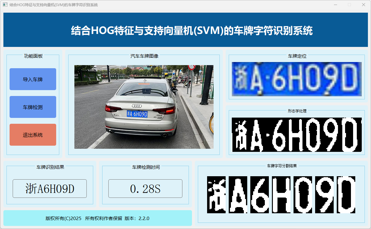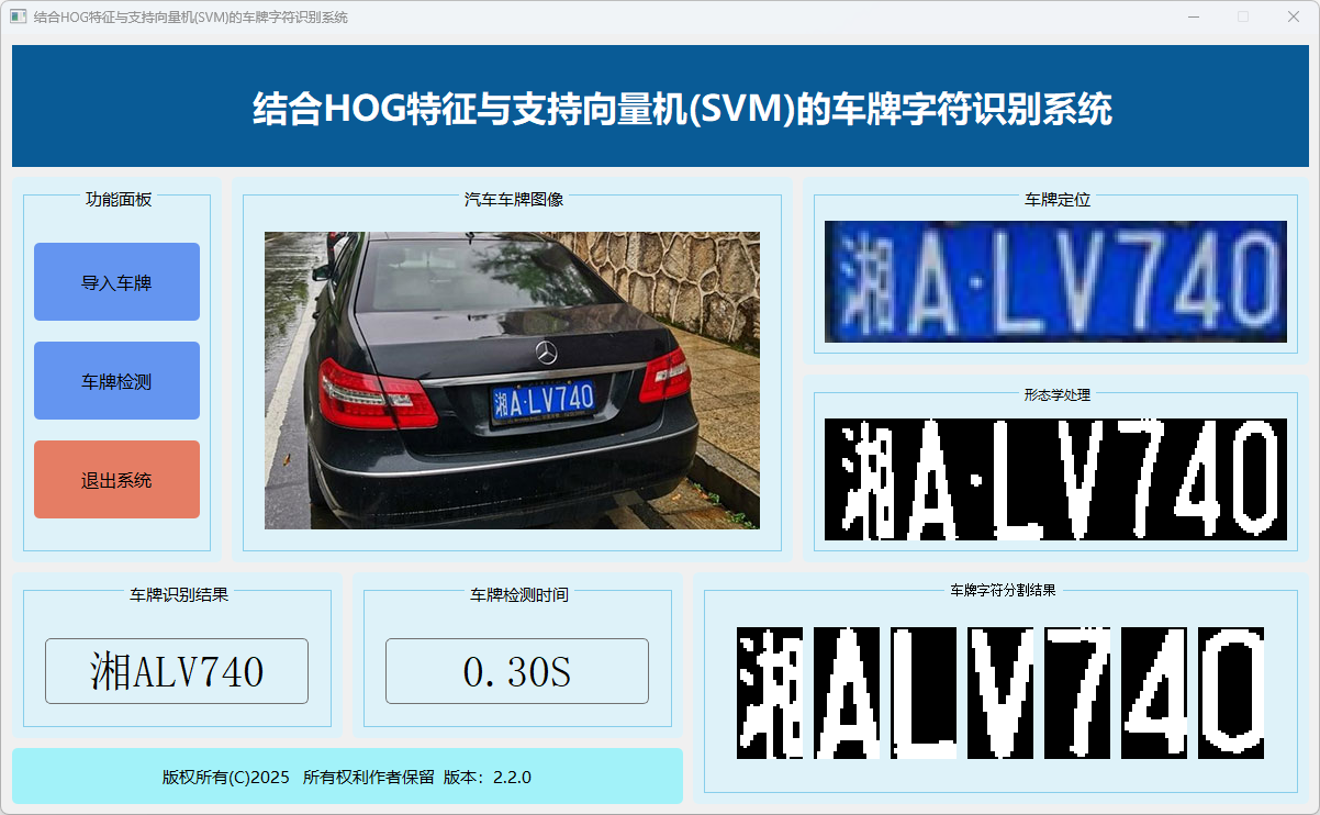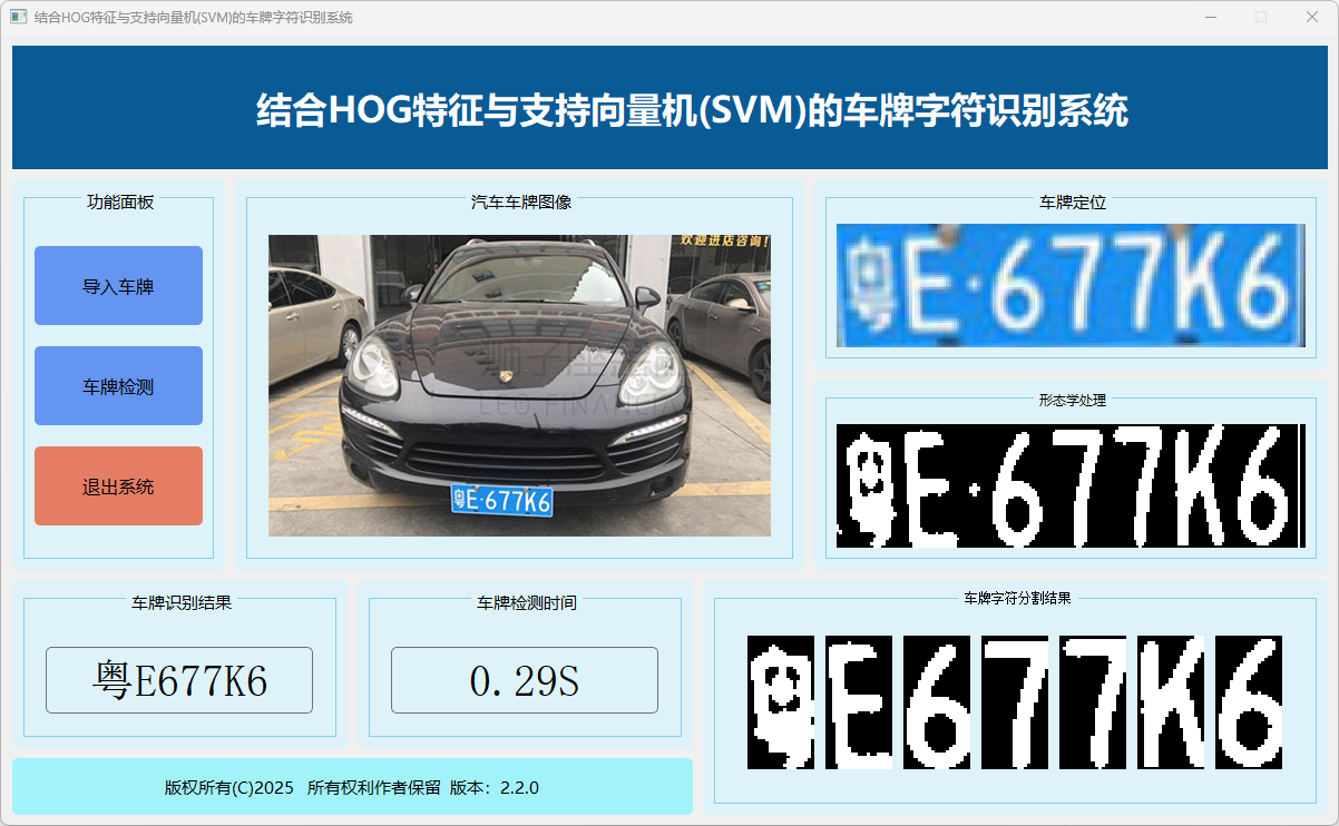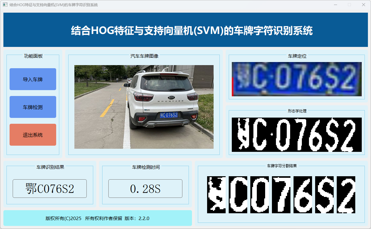 本系统基于HOG(方向梯度直方图)特征与支持向量机(SVM),实现车牌字符自动识别,集成图像预处理、特征提取、分类推理与结果可视化,为车牌字符识别提供高效、稳定的技术支持。