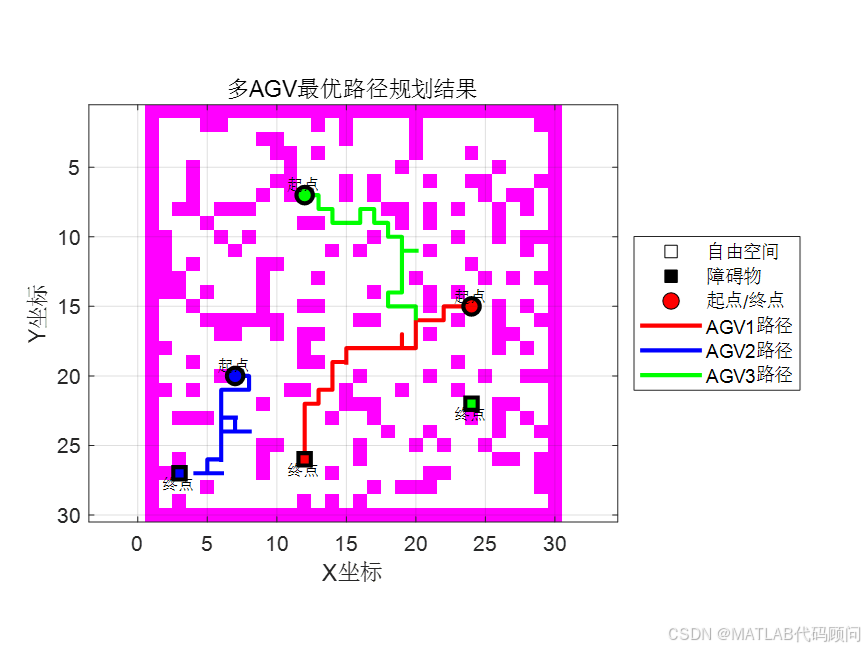 [grid_map, start_points, end_points] = createEnvironment(grid_size, num_agvs);%% 执行遗传算法优化