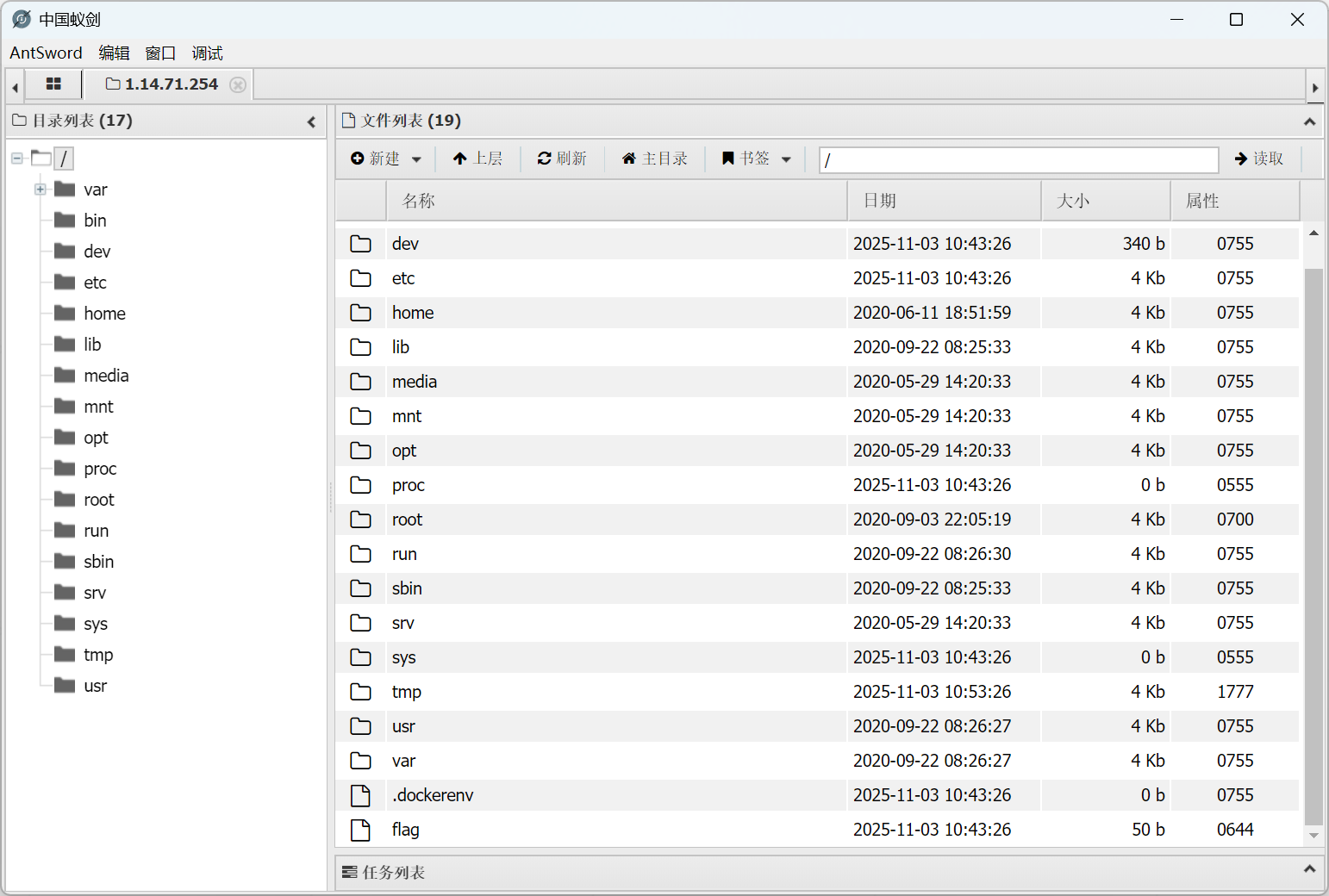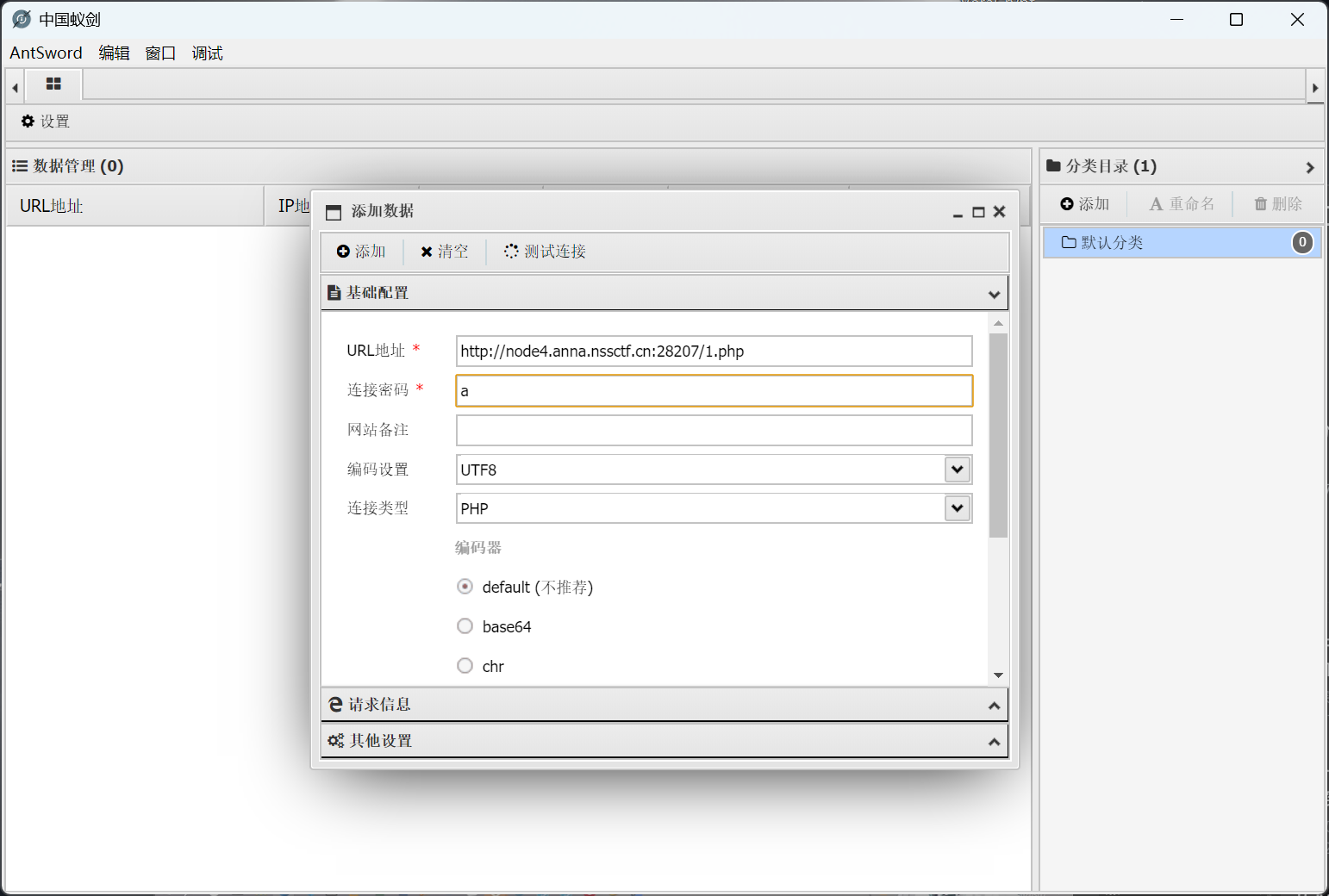 3.上传成功后使用蚁剑进行连接(注:这里是对/1.php进行连接,因为题目上面有提示直接上传到了网页的跟目录)