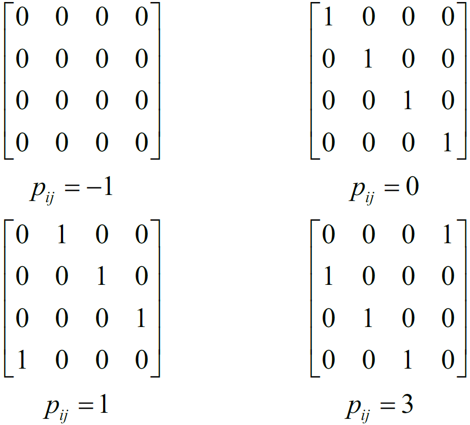 以扩展因子为Z =4 为例,下图给出了不同移位值下对应的移位矩阵:
