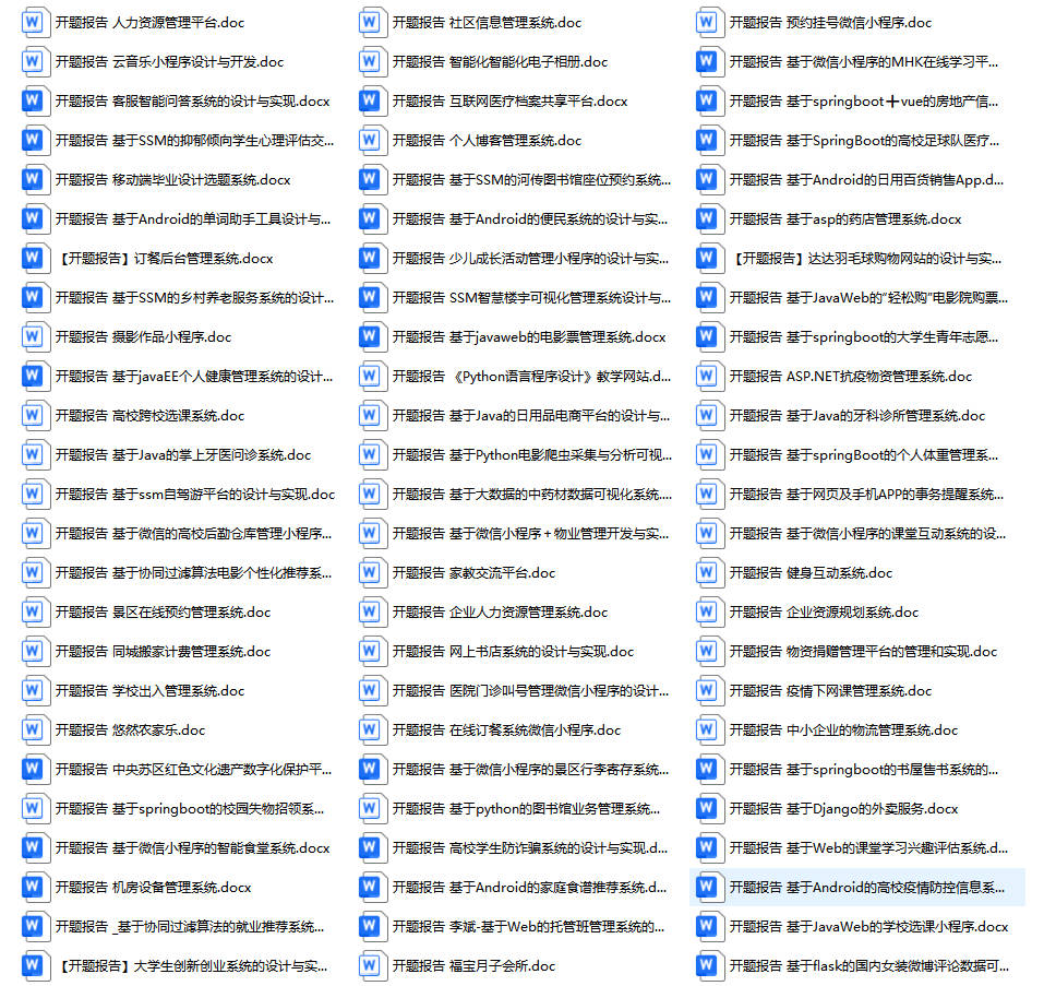 以上是某同学的毕业设计答辩的过程,如果你现在还没有参加答辩,还是开题阶段,已经选好了题目不知道怎么写开题报告,可以下面找找有没有自己符合自己题目的开题报告内容,列表中的开题报告都是往届真实的开题报告,可发送使用或参考。文末或底部来联xi可免费获取