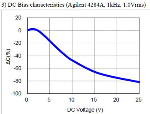 如下图,1uF/25V贴片电容为例,横坐标是直流电压,纵坐标是电容量的偏差量。
