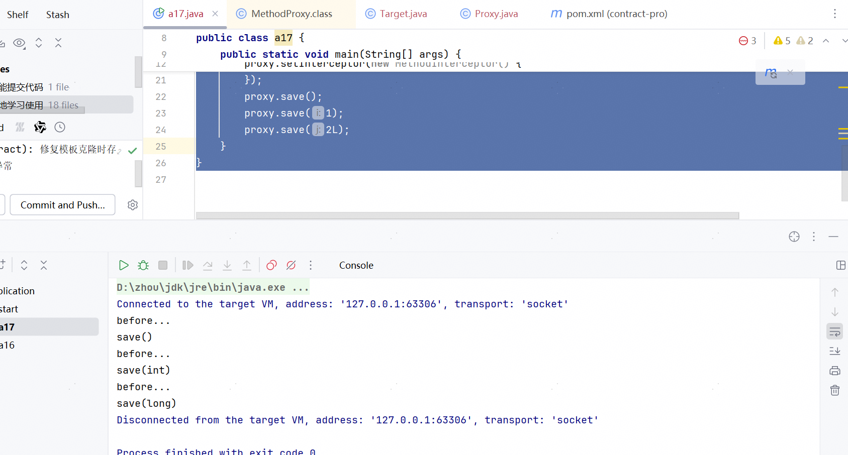 import org.springframework.cglib.proxy.MethodProxy;import java.lang.reflect.Method;public class a17 {public static void main(String[] args) {Proxy proxy = new Proxy();Target target = new Target();proxy.setInterceptor(new MethodInterceptor() {@Overridepublic Object intercept(Object p, Method method, Object[] objects, MethodProxy methodProxy) throws Throwable {System.out.println("before...");/*Object invoke = method.invoke(target, objects);//反射调用return invoke;*//*return methodProxy.invokeSuper(p,objects);//内部无反射,结合代理调用*/return methodProxy.invoke(target,objects);//内部无反射,结合目标对象调用}});proxy.save();proxy.save(1);proxy.save(2L);}