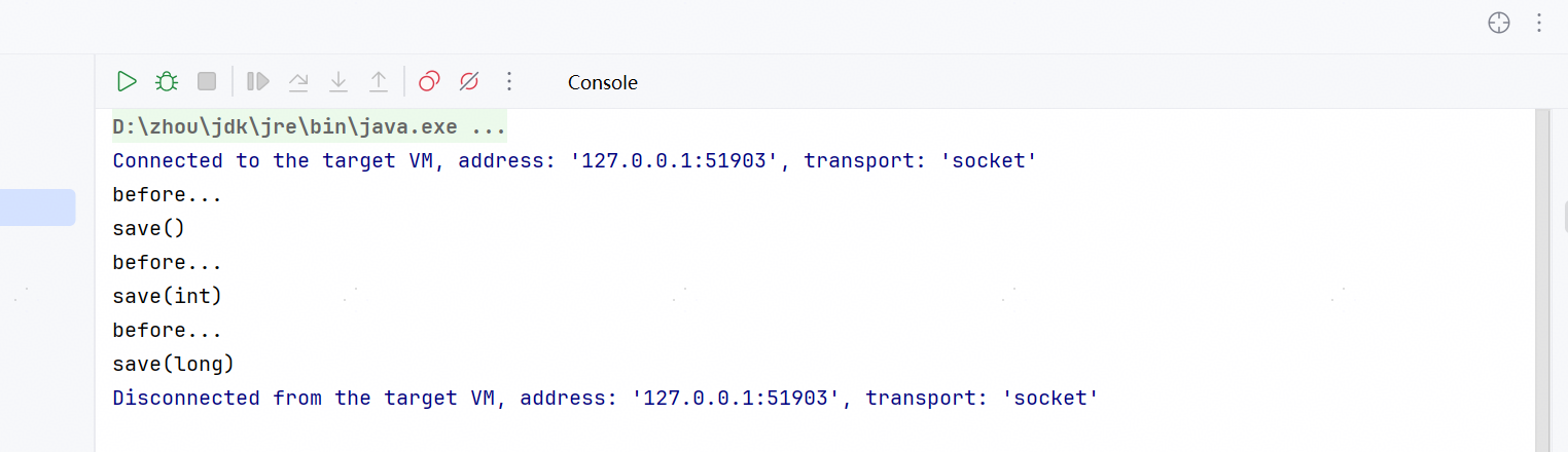 import org.springframework.cglib.proxy.MethodProxy;import java.lang.reflect.Method;public class a17 {public static void main(String[] args) {Proxy proxy = new Proxy();Target target = new Target();proxy.setInterceptor(new MethodInterceptor() {@Overridepublic Object intercept(Object p, Method method, Object[] objects, MethodProxy methodProxy) throws Throwable {System.out.println("before...");/*Object invoke = method.invoke(target, objects);//反射调用return invoke;*/return methodProxy.invokeSuper(p,objects);//内部无反射,结合代理调用}});proxy.save();proxy.save(1);proxy.save(2L);}