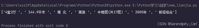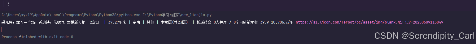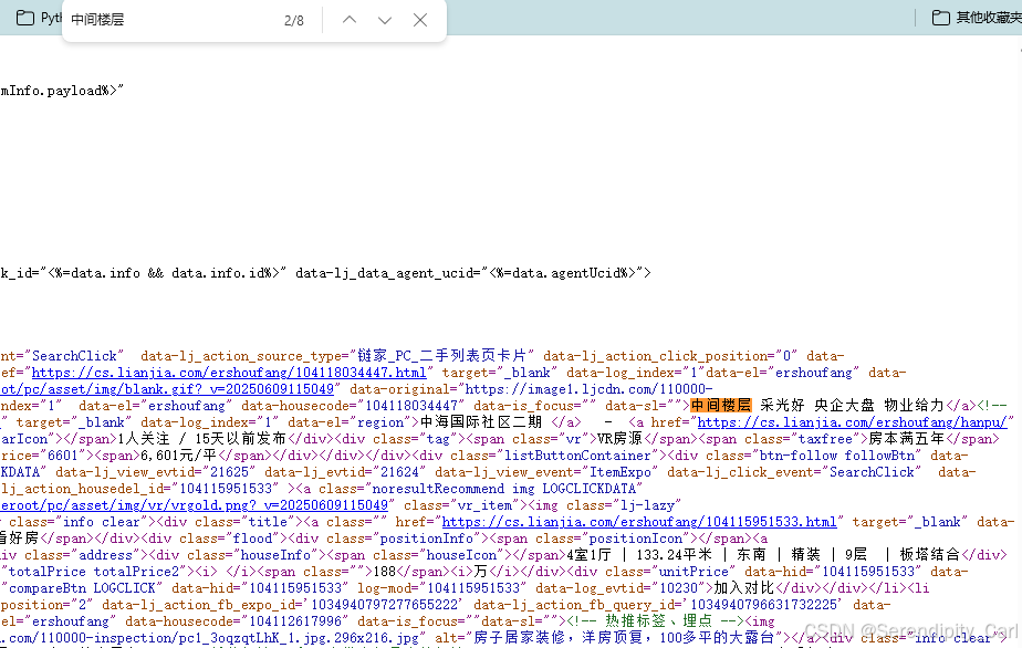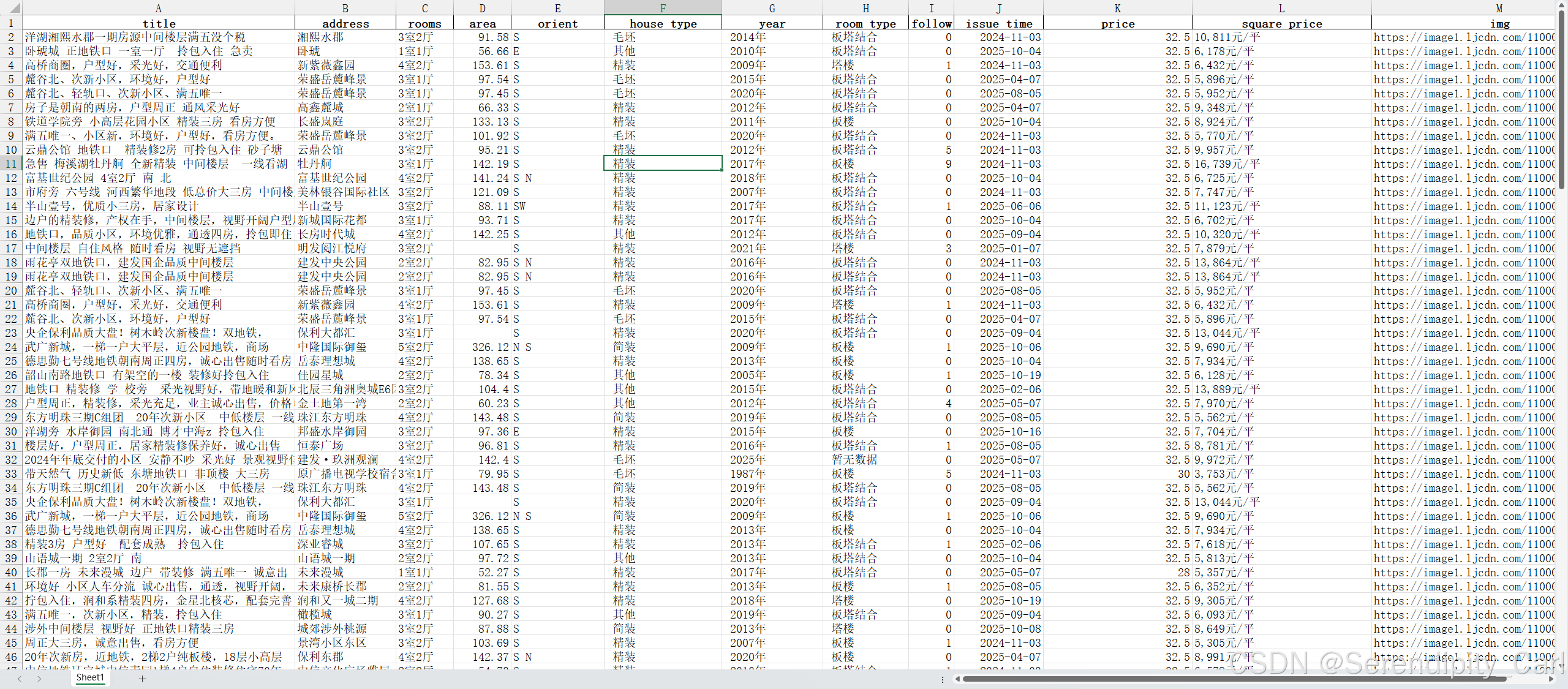 for i in range(1,11):url = f'https://cs.lianjia.com/ershoufang/pg{i}/'# 请求体headers = {'user-agent':'Mozilla/5.0 (Windows NT 10.0; Win64; x64) AppleWebKit/537.36 (KHTML, like Gecko) Chrome/141.0.0.0 Safari/537.36 Edg/141.0.0.0','referer':'https://cs.lianjia.com/','cookie':'select_city=430100; lianjia_uuid=40cfad10-6028-4fa5-98e7-f64cc30f5e1f; Hm_lvt_46bf127ac9b856df503ec2dbf942b67e=1761456276; HMACCOUNT=2EDE6B4FF192C403; _jzqc=1; _jzqckmp=1; sajssdk_2015_cross_new_user=1; sensorsdata2015jssdkcross=%7B%22distinct_id%22%3A%2219a1ef9c78e6c6-07959c473245b58-4c657b58-3686400-19a1ef9c78fc3f%22%2C%22%24device_id%22%3A%2219a1ef9c78e6c6-07959c473245b58-4c657b58-3686400-19a1ef9c78fc3f%22%2C%22props%22%3A%7B%22%24latest_traffic_source_type%22%3A%22%E7%9B%B4%E6%8E%A5%E6%B5%81%E9%87%8F%22%2C%22%24latest_referrer%22%3A%22%22%2C%22%24latest_referrer_host%22%3A%22%22%2C%22%24latest_search_keyword%22%3A%22%E6%9C%AA%E5%8F%96%E5%88%B0%E5%80%BC_%E7%9B%B4%E6%8E%A5%E6%89%93%E5%BC%80%22%7D%7D; _qzjc=1; _ga=GA1.2.232101018.1761456287; _gid=GA1.2.1226634737.1761456287; crosSdkDT2019DeviceId=-rpv6dr--190h9s-lgasbfwtoyze63k-gir0i2fuf; _jzqa=1.172784459768417000.1761456277.1761456277.1761459496.2; Hm_lpvt_46bf127ac9b856df503ec2dbf942b67e=1761459550; _qzja=1.2127940051.1761456277714.1761456277714.1761459496327.1761459544138.1761459550314.0.0.0.6.2; _qzjto=6.2.0; srcid=eyJ0Ijoie1wiZGF0YVwiOlwiZTE4YzBjN2Q2NWEwMTM1MzU5ODMzYjM4OTlmODM5NGRiZWRiOTUyODBlNmM2Zjg3MjU2YzNkMTQ4MjJmOWFlZTQ4M2I1MzljODVmMGJjYzYyZTM5NmUwYzc1YzQ4OTExYTAwNjFjZjAyZmM1YzgyODcwMjkyNzBkOWM1Zjg0MGNlM2NjZGIxOTU1NjBiY2RhNzhkMDBlZjE2OGZiNTg4NmJkMzExZTBmZTE0NmJmMDY4MjRlZGJhMjJmYzlkZDBmMzU2OTkzYjliZTE5Y2IwZTJkZGU1MjBmYzY1NGFiNTVlZThjZmViYWIyNTZkM2U0NGNjMDAyNTMxYWFlOTAxOFwiLFwia2V5X2lkXCI6XCIxXCIsXCJzaWduXCI6XCJhNWQ4Zjk5YVwifSIsInIiOiJodHRwczovL2NzLmxpYW5qaWEuY29tL2Vyc2hvdWZhbmcvIiwib3MiOiJ3ZWIiLCJ2IjoiMC4xIn0=; _ga_4JBJY7Y7MX=GS2.2.s1761459508$o2$g1$t1761459562$j6$l0$h0; lianjia_ssid=53f9dd1f-4942-34e4-1128-73bc6a6017cd'}resp = requests.get(url, headers=headers)select = parsel.Selector(resp.text)lis = select.css('.sellListContent li')for li in lis:title = li.css('.title a::text').get()address = li.css('.positionInfo a::text').get()if li.css('.houseInfo ::text'):house_info = li.css('.houseInfo ::text').get().split('|')rooms = house_info[0]area = house_info[1]orient = house_info[2]house_type = house_info[3]floor = house_info[4]year = house_info[-2] if '年' in house_info[-2] else 'None'room_architecture = house_info[-1]else:continuefollow = li.css('.followInfo ::text').get().split('/')[0]issue_time = li.css('.followInfo ::text').get().split('/')[-1]price = li.css('.totalPrice.totalPrice2 span::text').get()square_price = li.css('.unitPrice span::text').get()img = li.css('.lj-lazy ::attr(data-original)').get()dit = {'title': title,'address': address,'rooms': rooms,'area': area,'orient': orient,'house_type': house_type,'floor': floor,'year': year,'room_type': room_architecture,'follow': follow,'issue_time': issue_time,'price': price,'square_price': square_price,'img': img,}all_data.append(dit)pd.DataFrame(all_data).to_excel('lianjia.xlsx', index=False)
