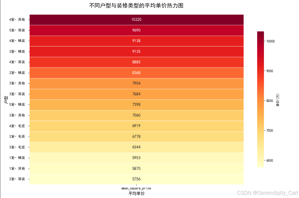 2. 按"房间数"和"装修类型"分组计算平均单价
