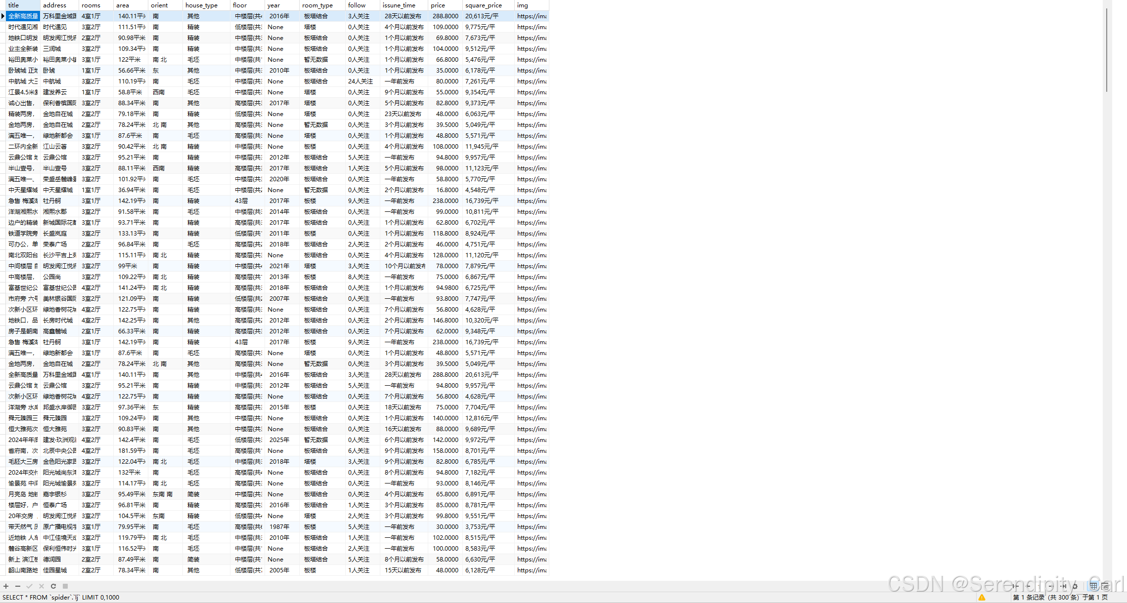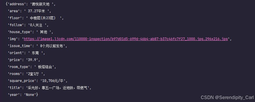 for li in lis:title = li.css('.title a::text').get()address = li.css('.positionInfo a::text').get()if li.css('.houseInfo ::text'):house_info = li.css('.houseInfo ::text').get().split('|')rooms = house_info[0]area = house_info[1]orient = house_info[2]house_type = house_info[3]floor = house_info[4]year = house_info[-2] if '年' in house_info[-2] else 'None'room_architecture = house_info[-1]else:continuefollow = li.css('.followInfo ::text').get().split('/')[0]issue_time = li.css('.followInfo ::text').get().split('/')[-1]price = li.css('.totalPrice.totalPrice2 span::text').get()square_price = li.css('.unitPrice span::text').get()img = li.css('.lj-lazy ::attr(data-original)').get()
