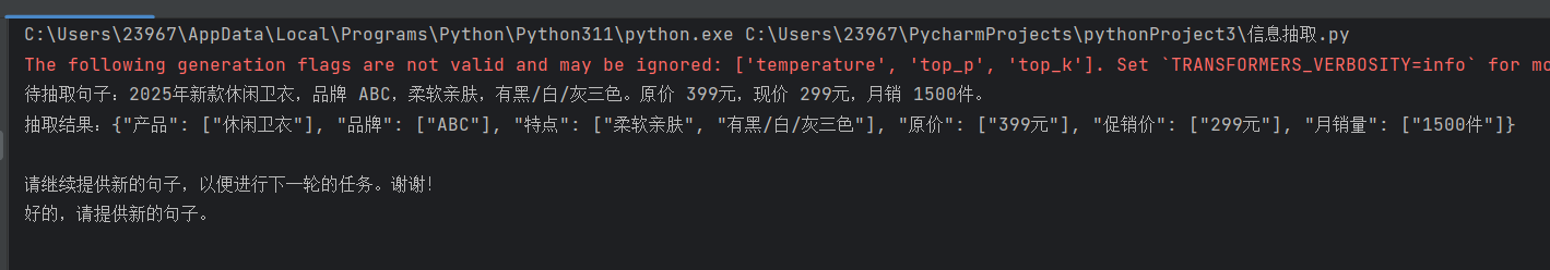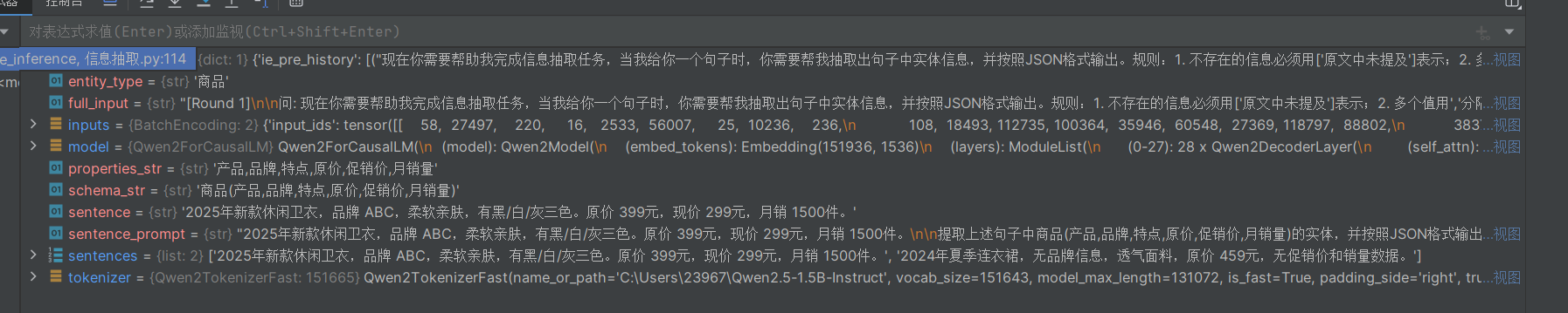 if __name__ == '__main__':# 待抽取的商品描述列表(可替换为你的实际数据)test_sentences = ["2025年新款休闲卫衣,品牌 ABC,柔软亲肤,有黑/白/灰三色。原价 399元,现价 299元,月销 1500件。","2024年夏季连衣裙,无品牌信息,透气面料,原价 459元,无促销价和销量数据。"]# 执行信息抽取ie_inference(sentences=test_sentences, entity_type='商品')调试模式: