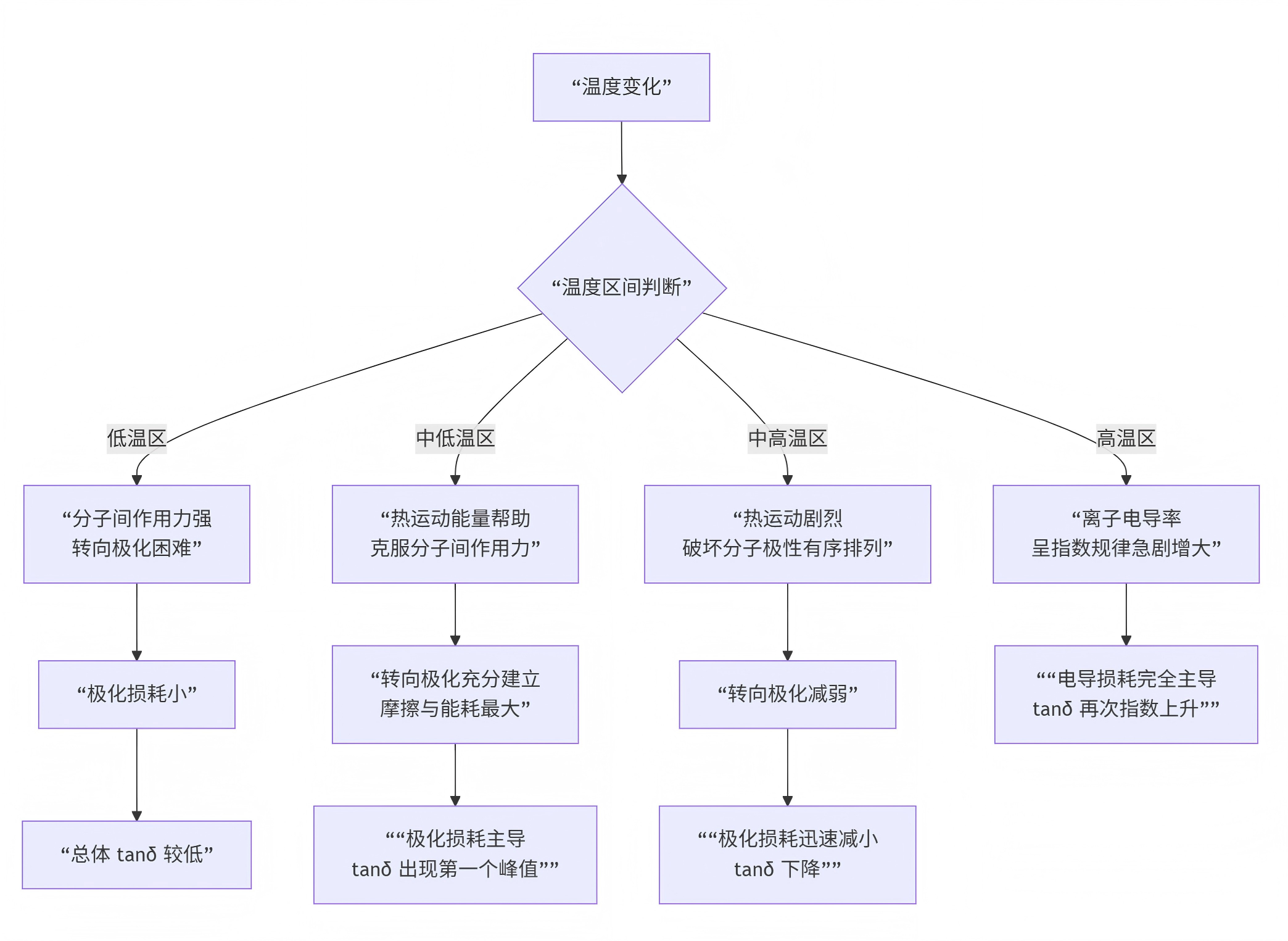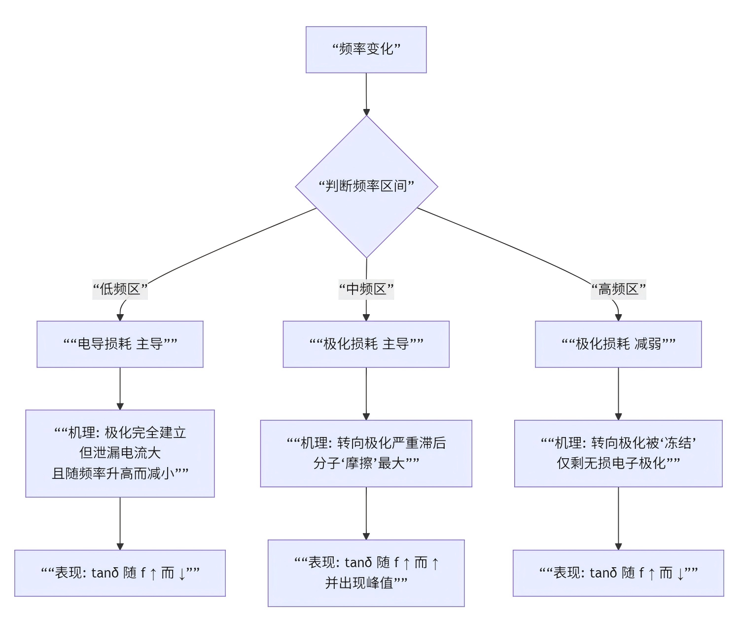 这个“先降后升再降”的曲线,完美地描绘了极性介质中微观分子从“从容不迫”(低频,电导主导)到“拼命追赶”(中频,极化损耗主导),再到“放弃抵抗”(高频,极化冻结)的动态过程。理解这一规律对于在高频电路中选择合适的绝缘材料或电容器介质至关重要。