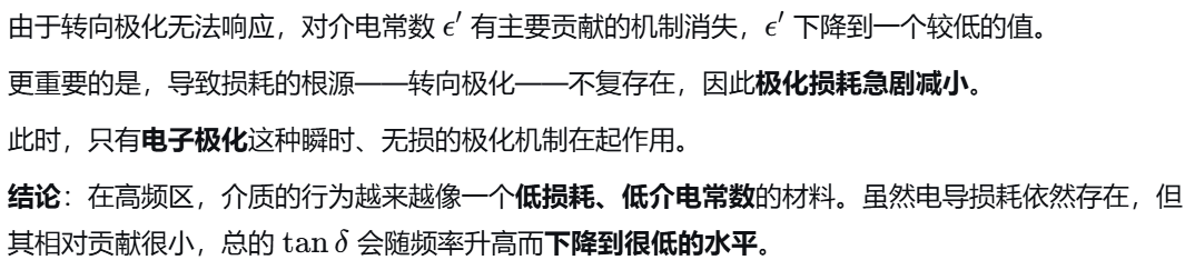 机理:频率过高,偶极子完全来不及转向,转向极化被“冻结”,极化损耗大幅下降。此时只剩下很小的电子极化损耗。