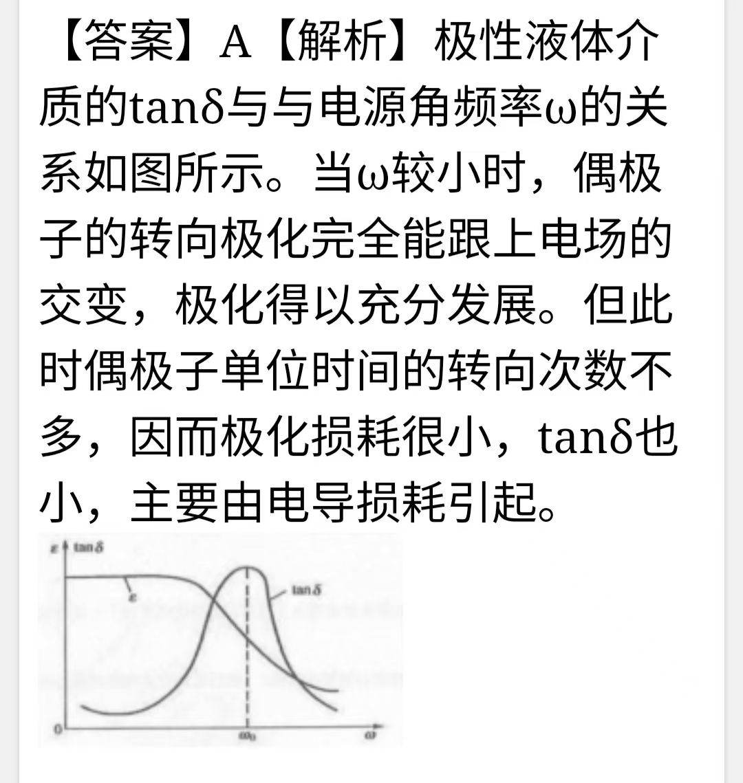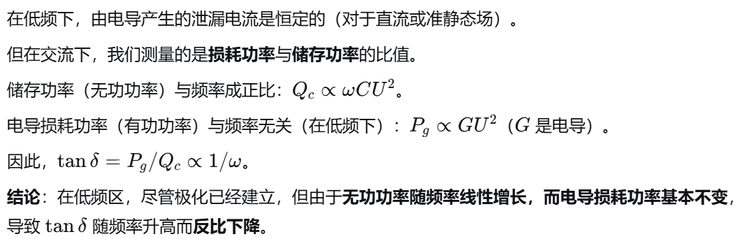 机理:频率很低时,转向极化能完全跟上电场变化,极化充分,但电导损耗 (∝σ/ω) 的贡献很大,且随频率升高而减小。 (个人:当电源频率ω较小时(w=2*pi*f),偶极子的转向极化完全能跟上电场的交变,极化得以充分发展。但此时偶极子单位时间的转向次数不多,因而极化损耗很小,tanδ也小,主要由电导损耗引起。)