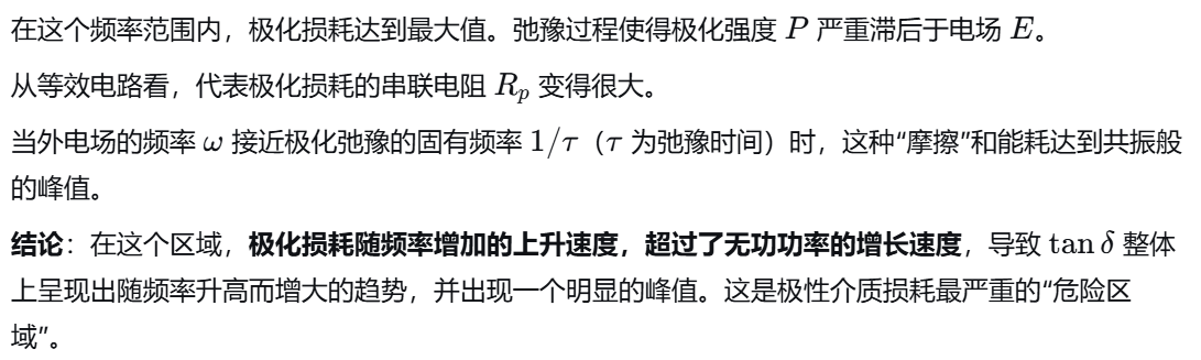 机理:频率升高到与偶极子转向的“弛豫时间”相匹配时,极化严重滞后,分子间“摩擦”最大,导致极化损耗达到峰值。这是极性介质损耗最大的“危险区域”。
