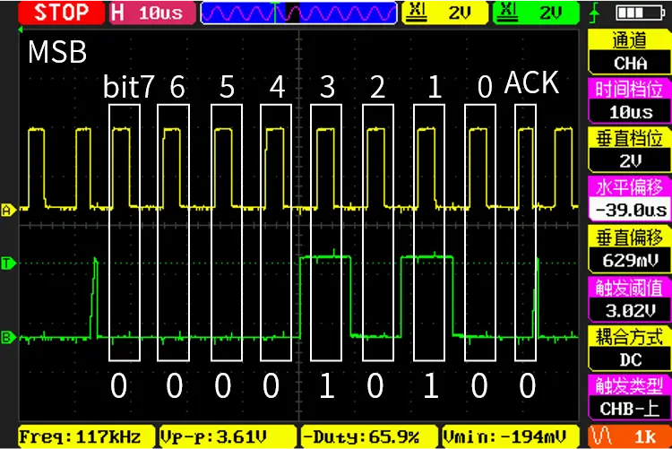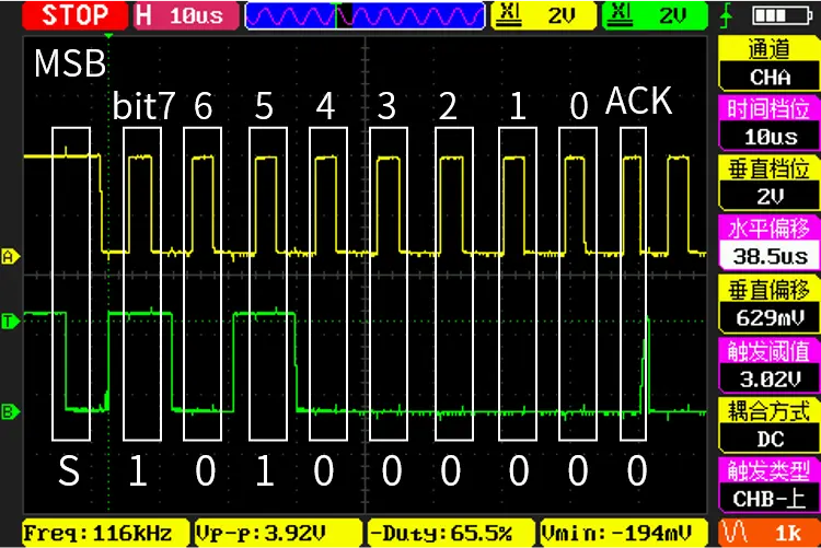 这里传输的就是数据内容,通过波形分析,传输的数据为 0x41。‘A’的ASCII 码值就是 0x41,发送与实际一致。随后便是从机的应答信号,低电平表示应答,最后便是经典的P停止信号,在SCL线为高电平的时候,数据线从低电平往高电平跳变。以上就是分析IIC波形图的过程。
