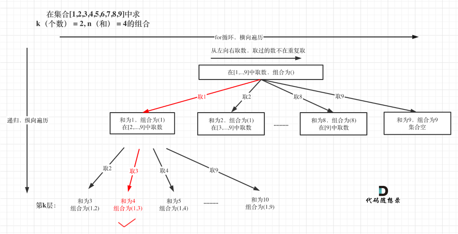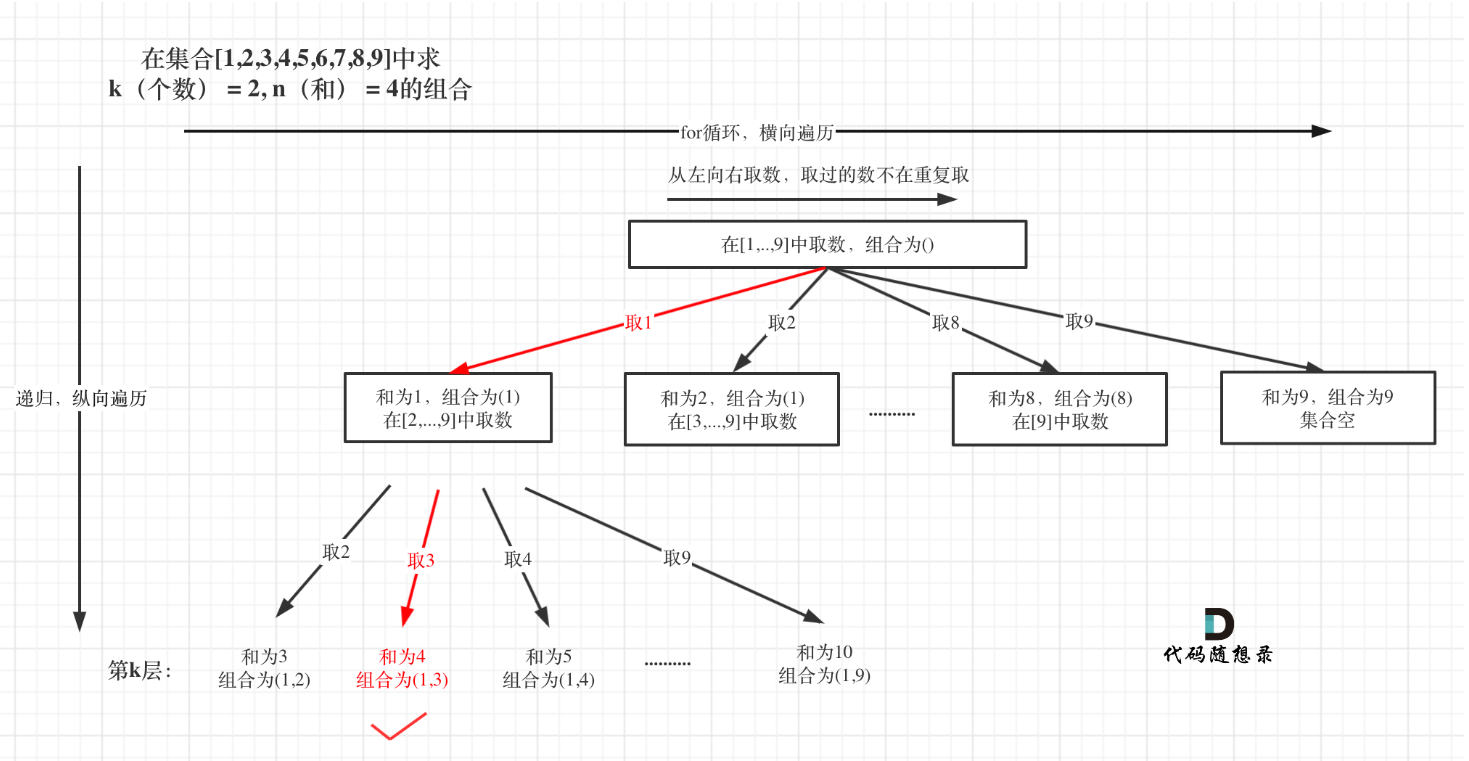 if (path.size() == k) {if (sum == targetSum) result.add(new ArrayList<>(path));return;}3.确定单层搜索的过程:横向遍历for循环就是固定的9个数[1,...,9],因此for循环固定i<=9。处理过程就是path收集每次选取的元素,相当于树形结构里的边,sum来统计path里元素的总和。处理过程要和回溯过程一一对应,处理有加回溯就要有减。