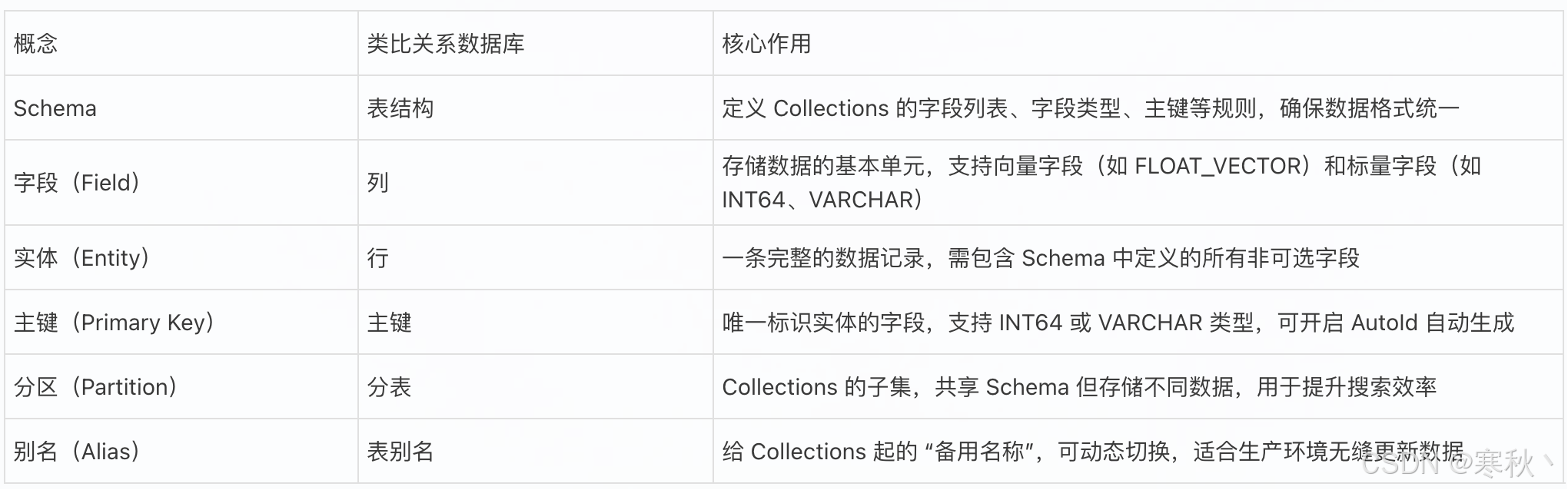 Collections 是 Milvus 中用于管理数据的 “二维表”,类比关系数据库中的 “表”,主要特点如下: