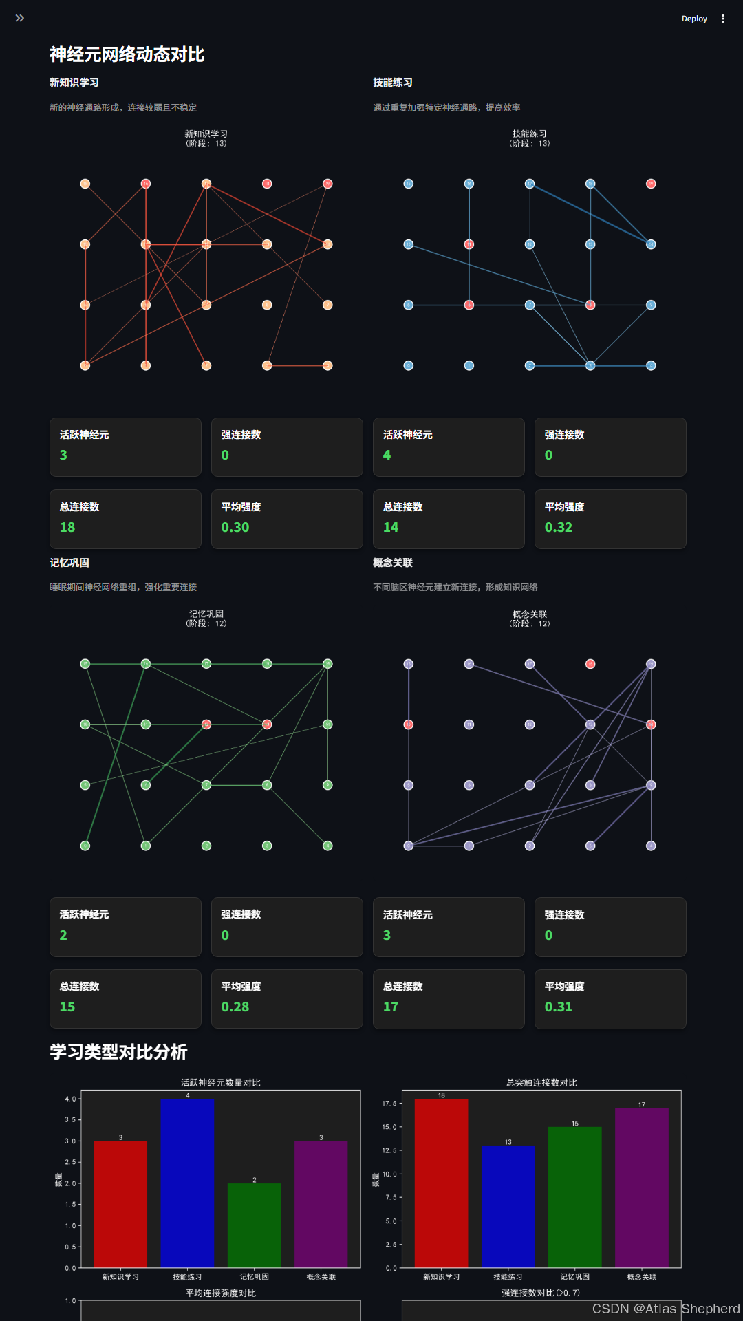 def simulate_learning_for_type(ltype):neurons = st.session_state[f'neurons_{ltype}']connections = st.session_state[f'connections_{ltype}']activated = st.session_state[f'activated_neurons_{ltype}']# 根据学习类型调整参数type_params = learning_types[ltype]adjusted_intensity = learning_intensity * type_params['intensity_factor']plasticity = type_params['plasticity']pruning_rate = type_params['pruning']# 根据学习强度激活一些神经元num_to_activate = max(2, int(len(neurons) * adjusted_intensity * 0.3))new_activated = random.sample(range(len(neurons)), num_to_activate)# 重置激活状态for neuron in neurons:neuron['active'] = Falseneuron['activation_level'] = 0.0# 激活选中的神经元for neuron_id in new_activated:neurons[neuron_id]['active'] = Trueneurons[neuron_id]['activation_level'] = 1.0activated.add(neuron_id)# 根据赫布理论加强同时激活的神经元之间的连接for conn in connections:if (neurons[conn['from']]['active'] and neurons[conn['to']]['active']):conn['strength'] = min(1.0, conn['strength'] + 0.1 * adjusted_intensity)conn['active'] = Trueneurons[conn['from']]['connections'][conn['to']] = conn['strength']else:conn['active'] = False# 根据睡眠质量进行记忆巩固if random.random() < sleep_quality * 0.1:conn['strength'] = min(1.0, conn['strength'] + 0.01)neurons[conn['from']]['connections'][conn['to']] = conn['strength']# 根据可塑性创建新连接if random.random() < plasticity:i, j = random.sample(range(len(neurons)), 2)existing_conn = next((c for c in connections if c['from'] == i and c['to'] == j), None)if not existing_conn:new_strength = random.uniform(0.1, 0.3)connections.append({'from': i,'to': j,'strength': new_strength,'active': False})neurons[i]['connections'][j] = new_strength# 突触修剪connections_to_remove = []for i, conn in enumerate(connections):if conn['strength'] < 0.1 and random.random() < pruning_rate:connections_to_remove.append(i)for i in sorted(connections_to_remove, reverse=True):conn = connections.pop(i)if conn['to'] in neurons[conn['from']]['connections']:del neurons[conn['from']]['connections'][conn['to']]st.session_state[f'learning_stage_{ltype}'] += 1# 绘制神经元网络的函数(针对特定学习类型)