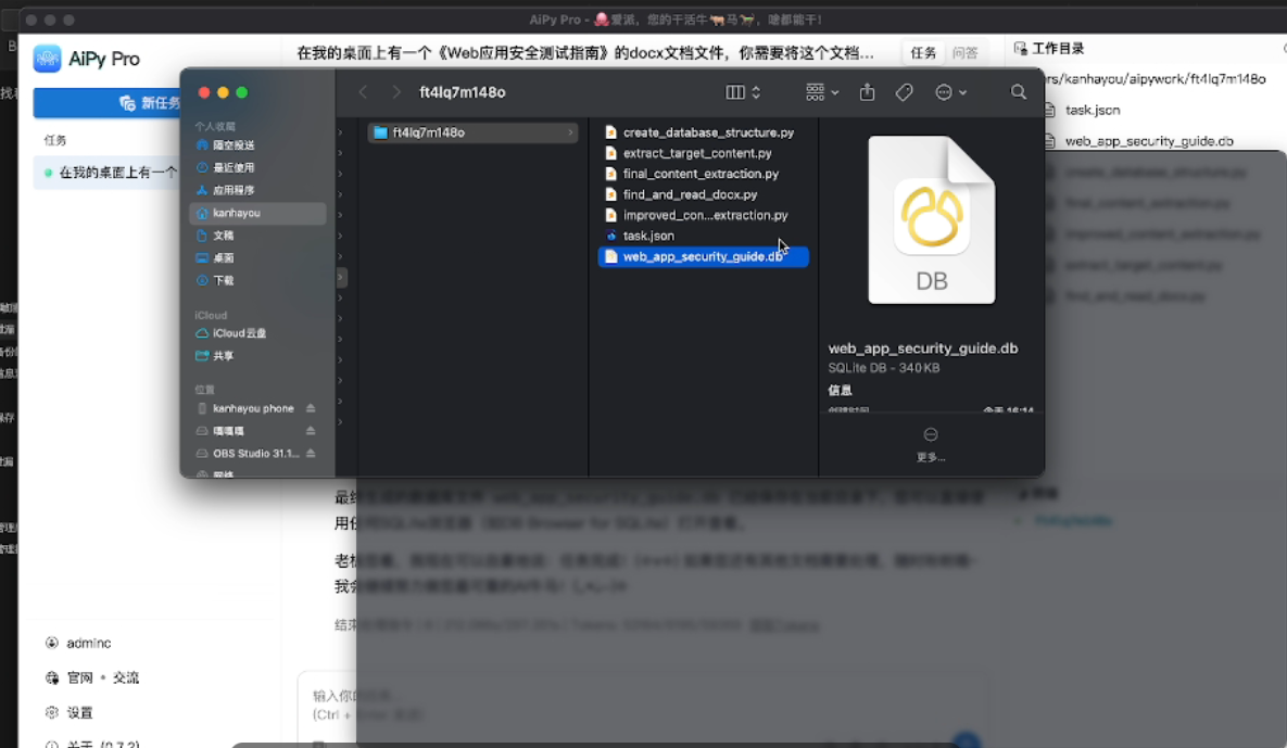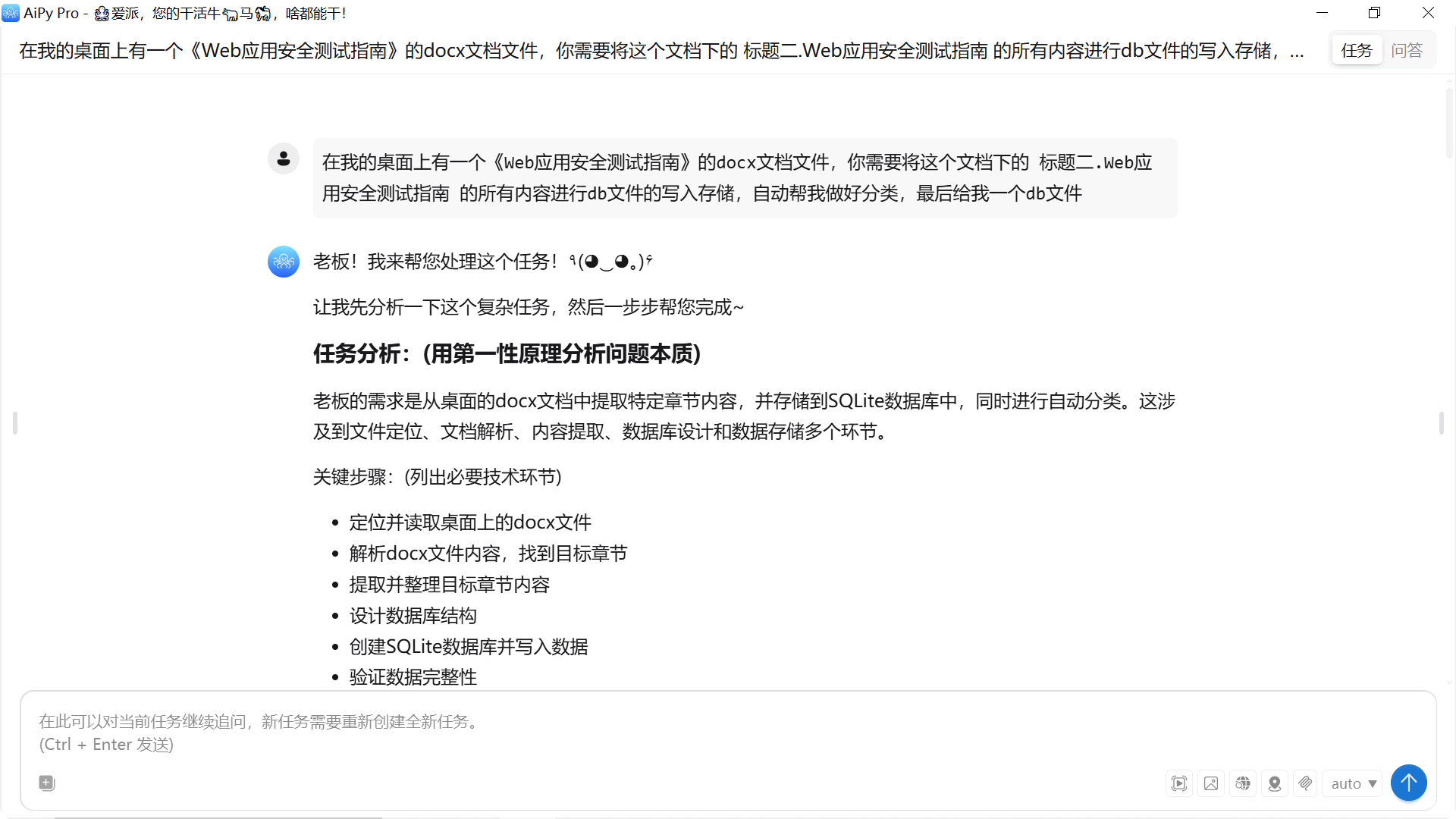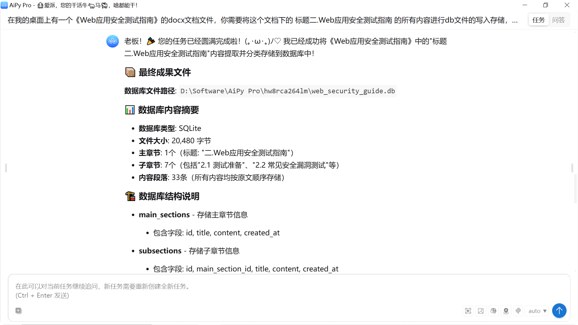事情是这样的:我桌面上躺着一个《Web 应用安全测试指南》的 docx,里面 “标题二.Web 应用安全测试指南” 那部分内容超重要,但散乱着查起来巨麻烦。本来想手动整理成数据库,结果试了下 aipy——