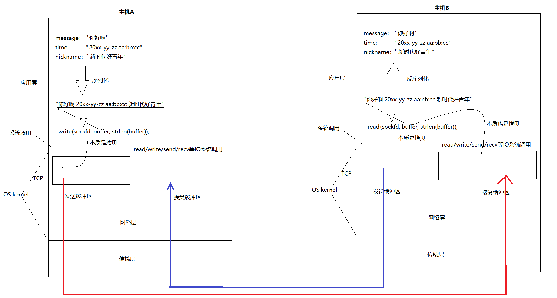 主机间通信的本质,时把发送方的发送缓冲区内的数据,拷贝到接收方的接收缓冲区中。