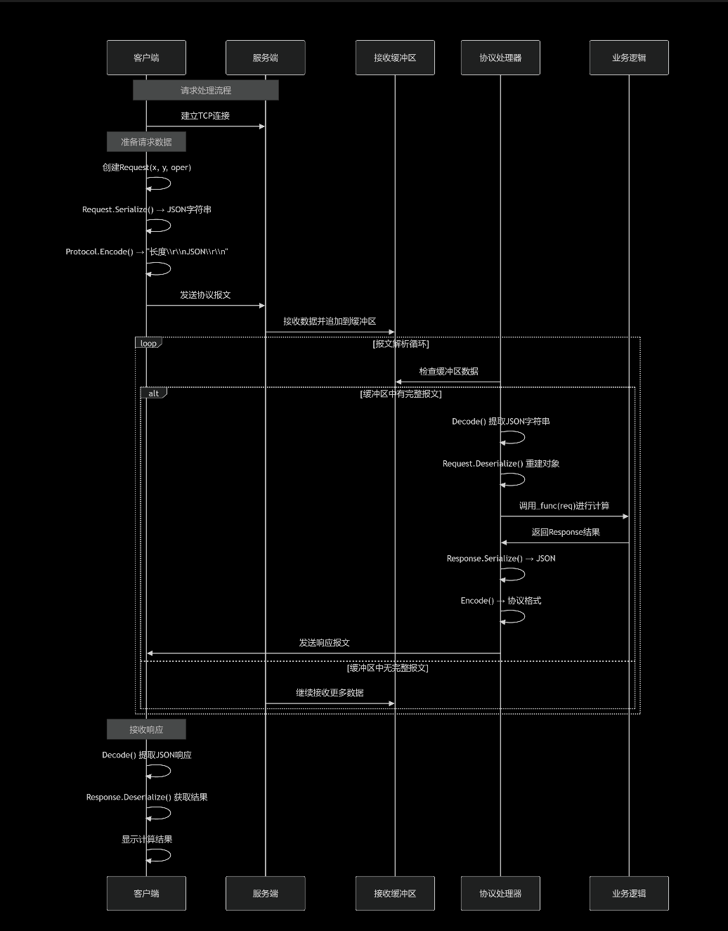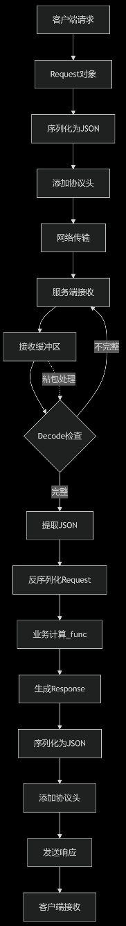 void GetRequest(std::shared_ptr<Socket> &sock, InetAddr &client) {std::string buffer_queue; // 接收缓冲区while (true) {int n = sock->Recv(&buffer_queue); // 读取数据到缓冲区if (n > 0) {std::string json_package;// 步骤1: 解析协议,提取完整JSON请求if (!Decode(buffer_queue, &json_package)) continue;// 步骤2: 反序列化JSON到Request对象Request req;if (!req.Deserialize(json_package)) continue;// 步骤3: 执行业务逻辑计算Response resp = _func(req); // 调用计算函数// 步骤4-6: 序列化响应并发送std::string json_str = resp.Serialize();std::string send_str = Encode(json_str);sock->Send(send_str);}else if (n == 0) {// 客户端断开连接break;}else {// 接收错误break;}}