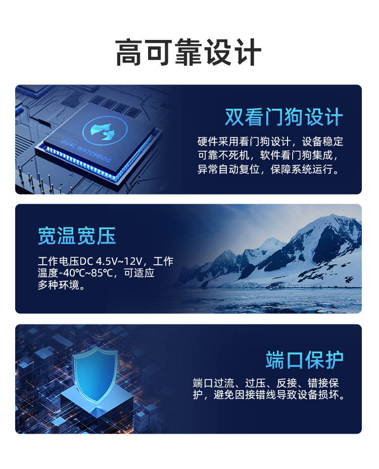 在可靠性方面,设备采用双看门狗设计,结合软件看门狗机制,有效防止系统死机,保障设备长期稳定运行。同时,端口具备过流、过压、反接和错接保护功能,有效避免因接线错误导致的设备损坏,进一步提升了系统的耐用性和安全性。