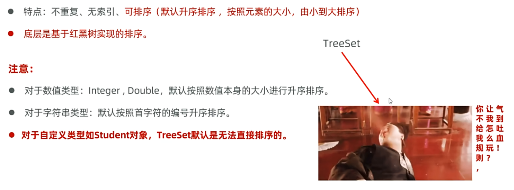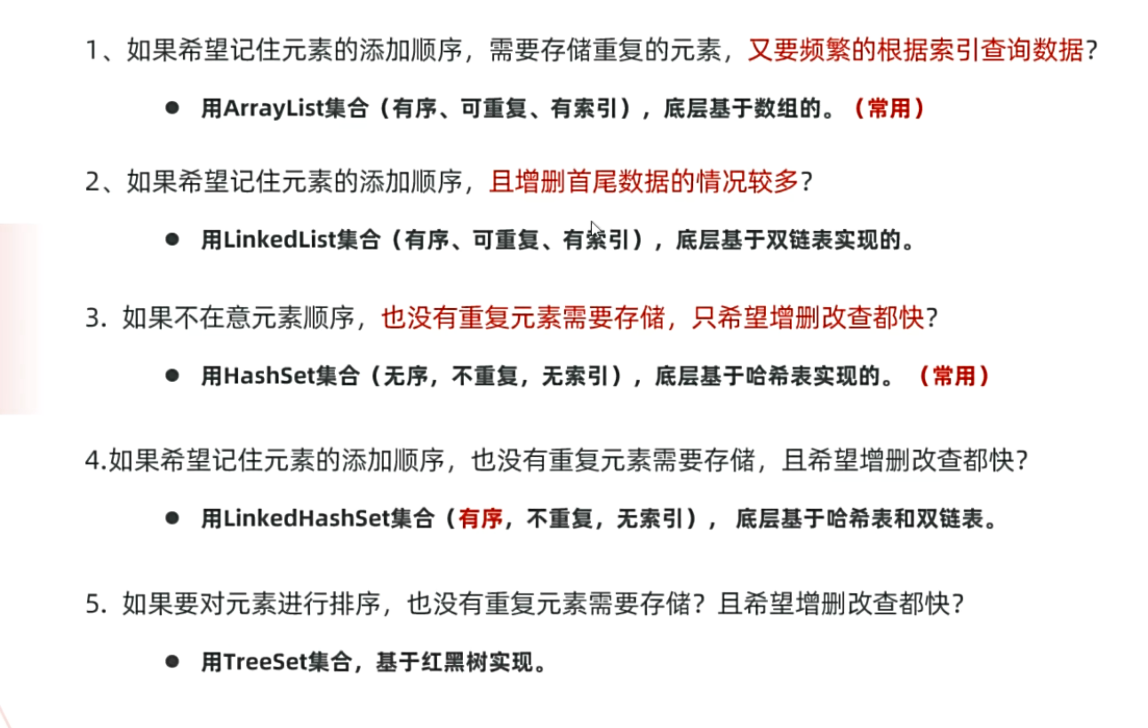 import java.util.TreeSet;public class SetDemo1 {public static void main(String[] args) {//// HashSet 无序,不可重复,无索引HashSet<String> set = new HashSet(); //一行经典代码set.add("hello");set.add("world");set.add("java");set.add("hello"); //添加重复元素set.add("55");System.out.println("无序,不可重复->: " + set);set.remove("55");System.out.println("删除55->: " + set);//LinkedHashSet//有序,不可重复,无索引LinkedHashSet<String> linkedHashSet = new LinkedHashSet();linkedHashSet.add("hello");linkedHashSet.add("world");linkedHashSet.add("java");linkedHashSet.add("hello");linkedHashSet.add("55");System.out.println("有序,不可重复->: " + linkedHashSet);//TreeSet////有序,不可重复,无索引TreeSet<String> treeSet = new TreeSet();treeSet.add("hello");treeSet.add("world");treeSet.add("java");treeSet.add("hello");treeSet.add("55");System.out.println("排序,不可重复->: " + treeSet);System.out.println("最小值->: " + treeSet.first());System.out.println("最大值->: " + treeSet.last());System.out.println("删除55->: " + treeSet.remove("55"));TreeSet< Integer> treeSet1 = new TreeSet();treeSet1.add(1);treeSet1.add(5);treeSet1.add(2);treeSet1.add(4);System.out.println("排序,不可重复->: " + treeSet1);//Str怎么遍历for (String s : treeSet) {System.out.println(s);}//迭代器for (Iterator<String> it = treeSet.iterator(); it.hasNext();) {String s = it.next();System.out.println(s);}//函数式treeSet1.forEach(s -> System.out.print(s + " "));}