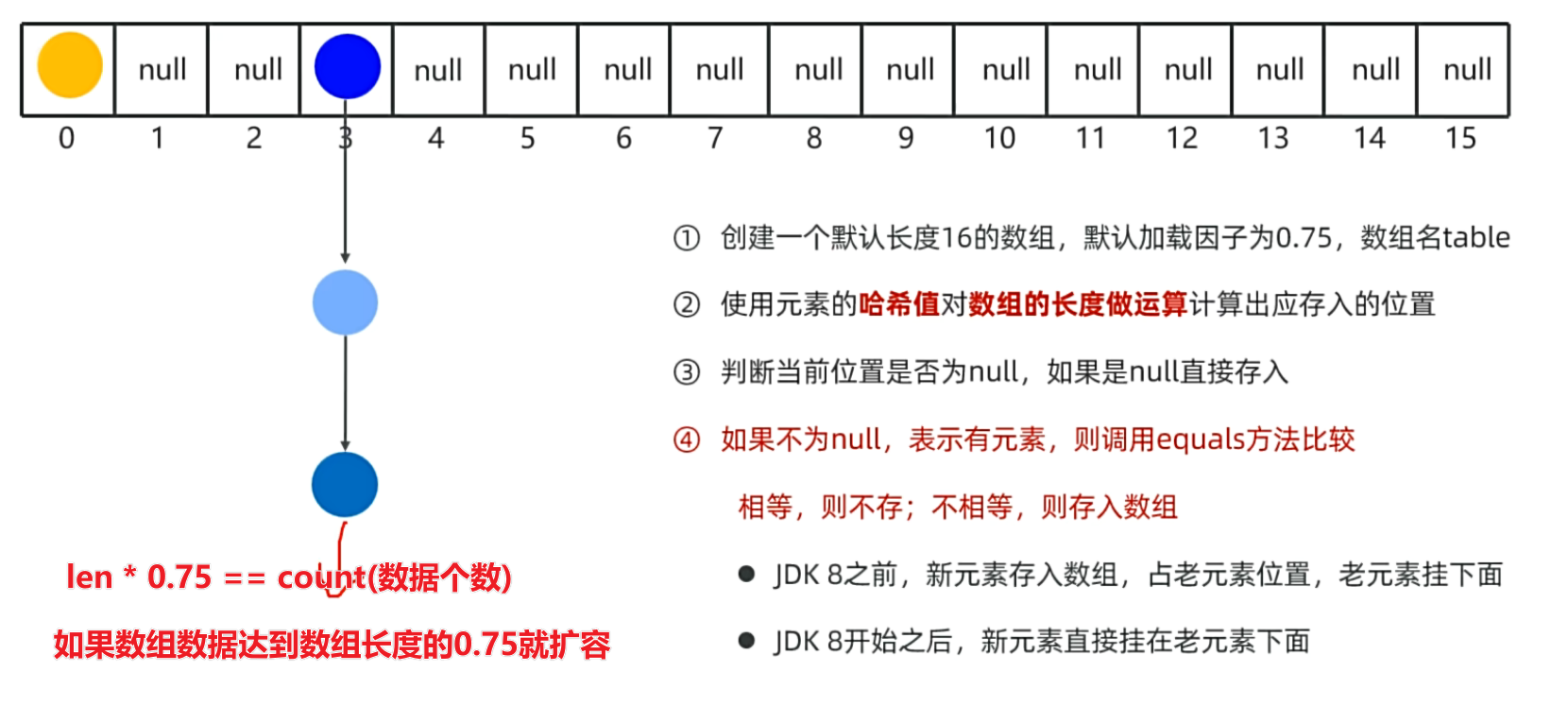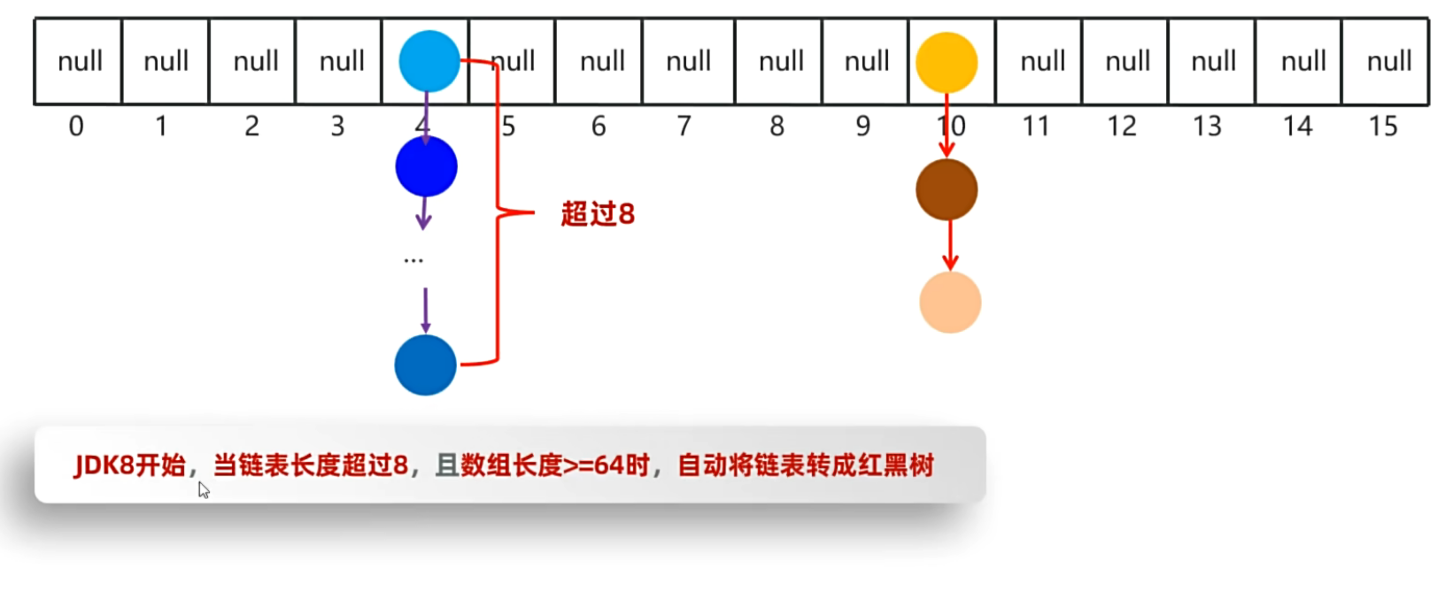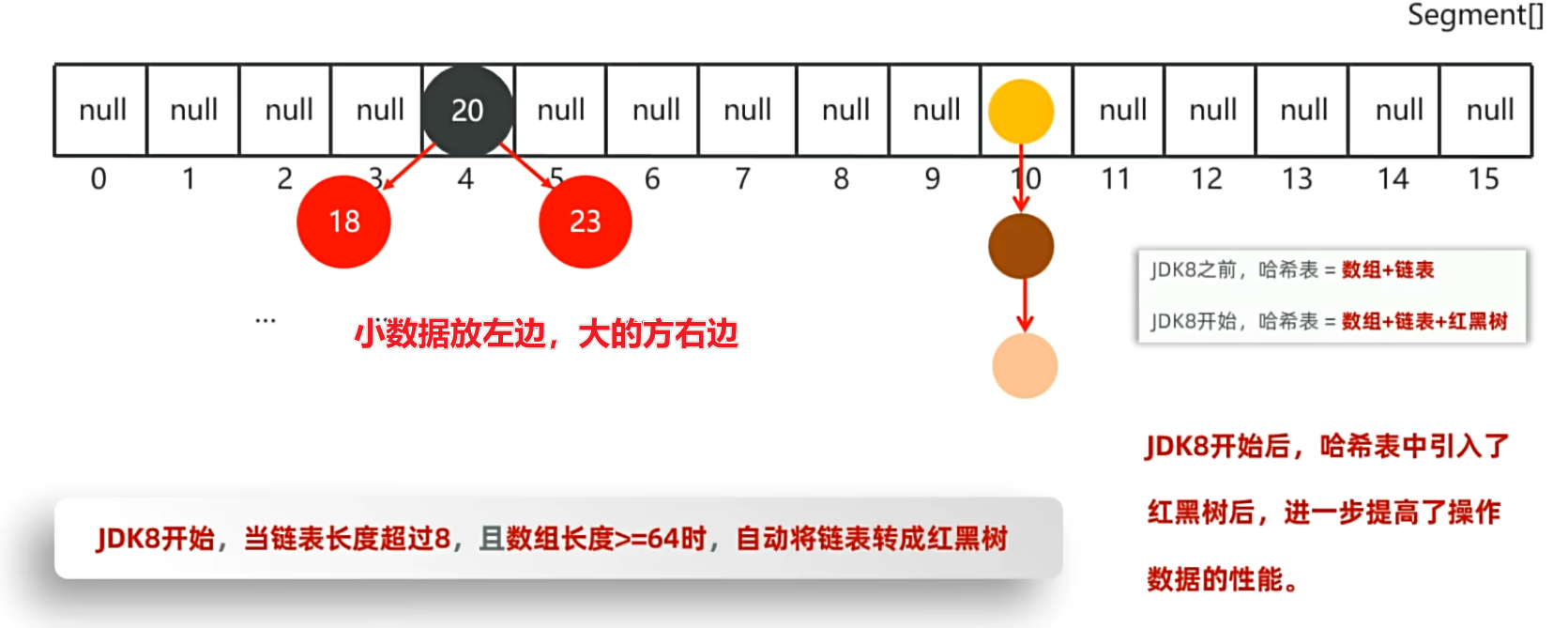 - JDK8开始,哈希表 = 数组 + 链表 + 红黑树