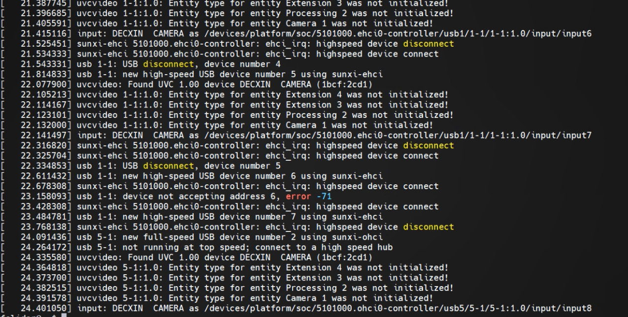 sunxi-ehci 5101000.ehci0-controller: ehci_irq: highspeed device disconnectsunxi-ehci 5101000.ehci0-controller: ehci irq: highspeed device connectusb 1-1: USB disconnect, device number 2uvcvideo: Failed to resubmit video URB (-19).uvcvideo: Failed to resubmit video URB (-19).uvcvideo: Failed to resubmit video URB (-19).uvcvideo: Failed to resubmit video URB (-19).uvcvideo: Failed to resubmit video URB (-19).sunxi-ehci 5101000.ehci0-controller: ehci_irq: highspeed device connectusb 1-1: new high-speed USB device number 3 using sunxi-ehciusb 1-1: device descriptor read/64, error -71usb 1-1: device descriptor read/64, error -71usb 1-1: new high-speed USB device number 4 using sunxi-ehciusb 1-1: device descriptor read/64, error -71uvcvideo: Found UVC 1.00 device DECXIN CAMERA (1bcf:2cd1)uvcvideo 1-1:1.0: Entity type for entity Extension 4 was not initialized!uvcvideo 1-1:1.0: Entity type for entity Extension 3 was not initialized!uvcvideo 1-1:1.0: Entity type for entity Processing 2 was not initialized!uvcvideo 1-1:1.0: Entity type for entity Camera 1 was not initialized!input: DECXIN CAMERA as /devices/platform/soc/5101000.ehci0-controller/usb1/1-1/1-1:1.0/input/input62.后面观察到,usb会不停的掉线,上线