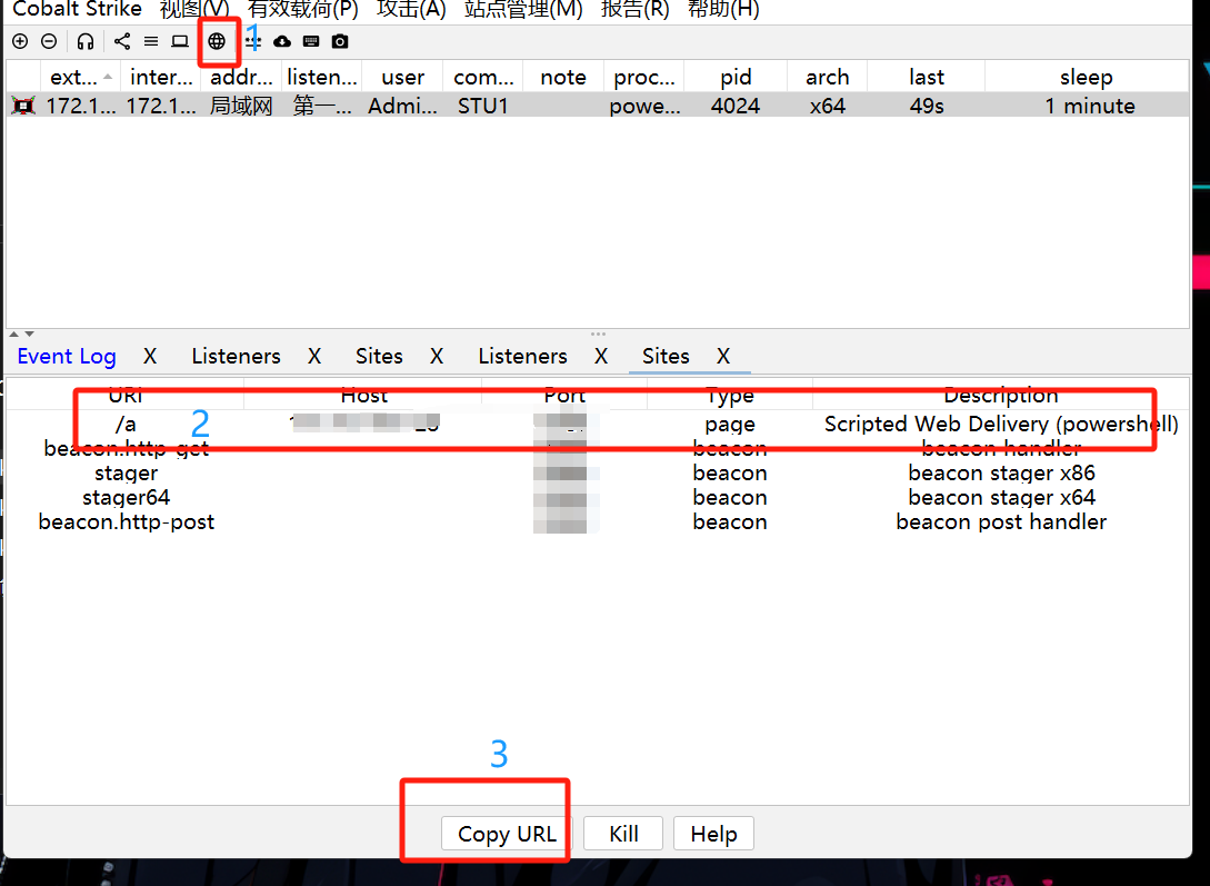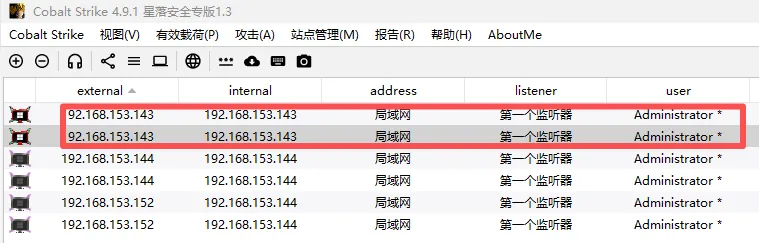 因为我们已经利用RCE漏洞进来了,我们就可以利用shell命令输入刚刚的Web投递,然后cobaltstrike就连上了肉鸡。
