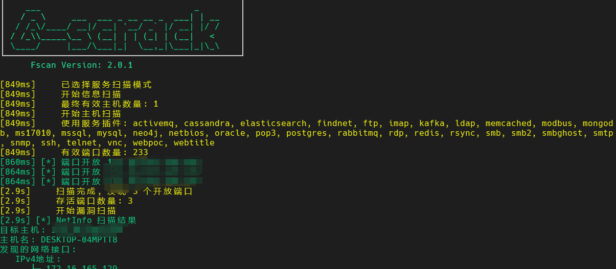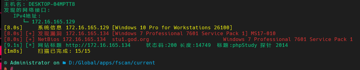 fscan.exe -h 192.168.x.x (全功能、ms17010、读取⽹卡信息)