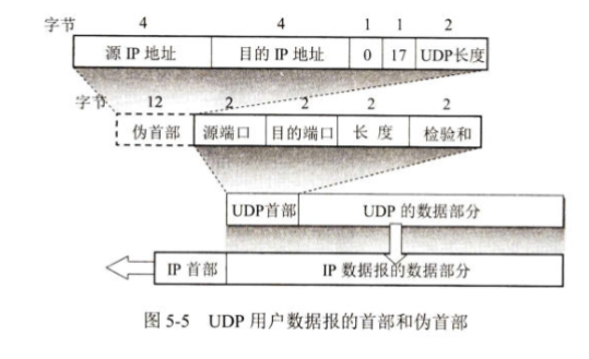 如图5-6所示,伪首部的第3字段是全零;第4字段是IP首部中的协议字段的值。以前曾讲过,对于UDP,此协议字段值为17;第5字段是UDP用户数据报的长度。因此,这样的检验和,既检查了UDP用户数据报的源端口号和目的端口号以及UDP用户数据报的数据部分,又检查了IP数据报的源IP地址和目的地址。