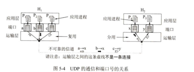 分用:接收方(如主机H₂)的运输层(UDP)从IP层收到数据报后,根据数据报首部中的目的端口号(x 或 y),将数据正确地交付给相应的应用进程(P₄ 或 P₅)。这就是一对多的分用。