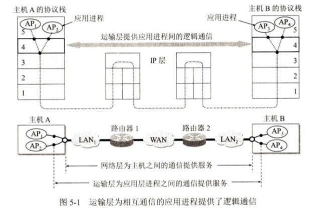 如图 5-1 所示,主机 A 的多个应用进程 AP₁、AP₂可分别与主机 B 的多个应用进程通信。