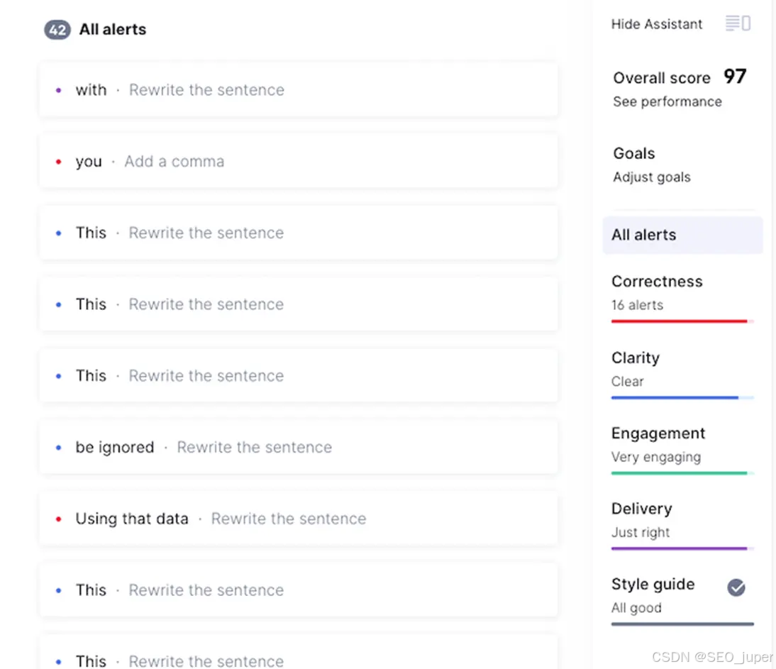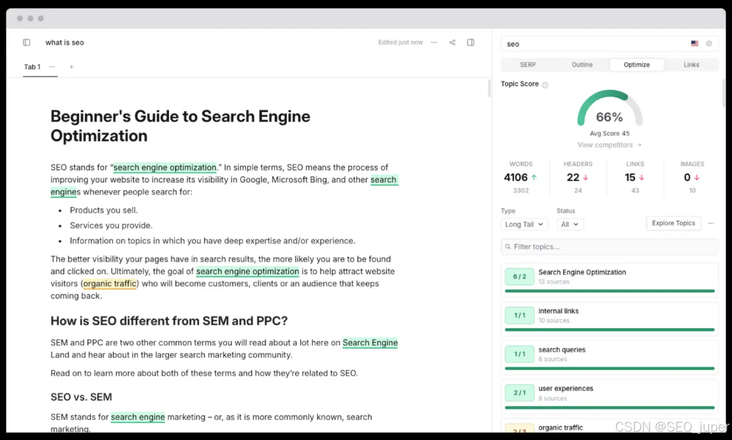 您的草稿会立即与排名靠前的内容进行比较。Surfer SEO、Clearscope 和 Frase 等平台建议包含关键字使用、内容长度、标题结构和相关主题。您确切地看到您的保险范围需要多么全面。