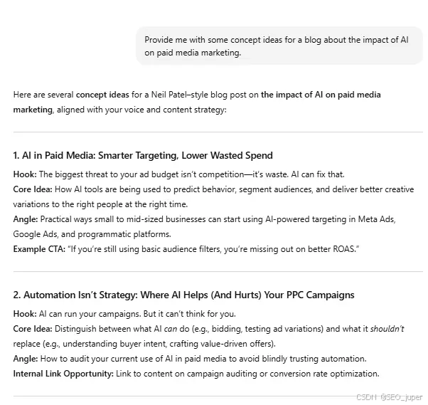 ChatGPT、Claude 和 Jasper 可以生成大纲、初稿和变体。但通用提示会产生通用内容。您的提示需要具体信息:目标关键字、所需的语气、目标受众以及您要解决的问题。更多的上下文意味着更好的输出。