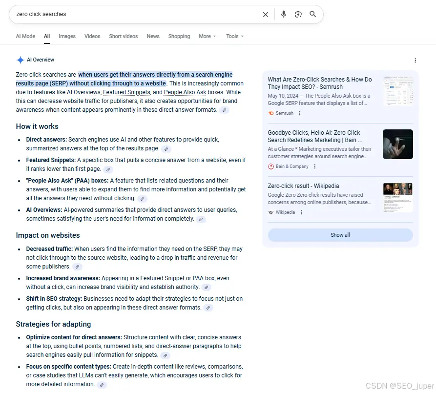 现在,越来越多的搜索在没有点击的情况下结束。Google 的 AI 概述、精选片段和知识面板直接在搜索结果中回答问题。这意味着您需要优化这些人工智能生成的摘要的可见性,而不仅仅是传统的蓝色链接排名。您的内容必须经过结构化,以便 AI 轻松提取和引用。