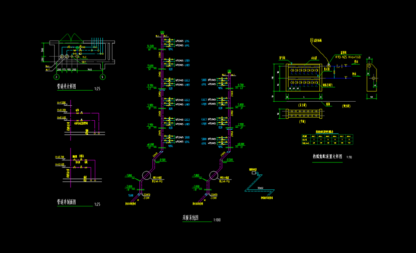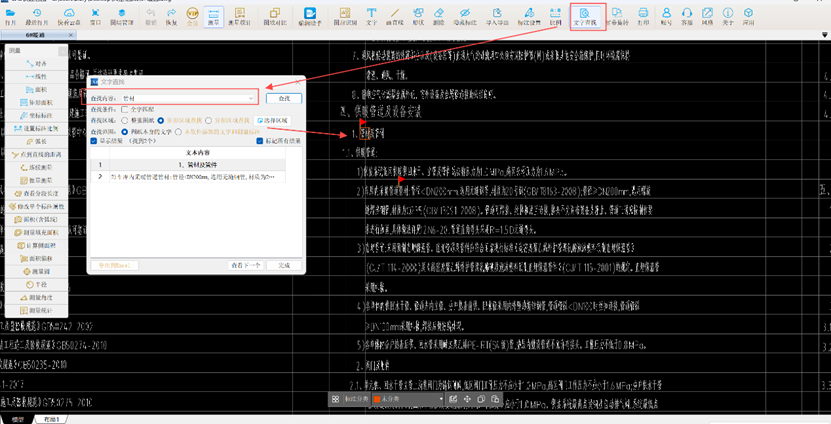 2. 为确定供、回水管的连接形式与管材,需详细查阅暖通空调施工总说明。利用CAD快速看图中【文字查找】功能,输入关键字“管材”即可迅速定位相关信息。如图所示,各单体内供回水干管、管道井内立管、分户热表前供、回水管均采用内外壁热镀锌钢管。管道管径小于DN100时采用丝扣连接,管径≥DN100mm则采用焊接,并在焊接后进行防腐处理。