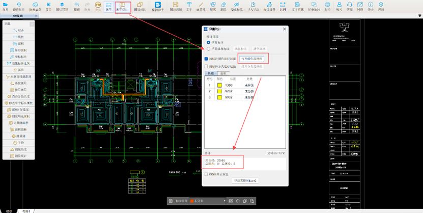 所有供、回水管测量完成后,使用【测量统计】功能,按颜色标注进行过滤。如图所示,水平供水管长度为20.81m,水平回水管长度为20.544m。