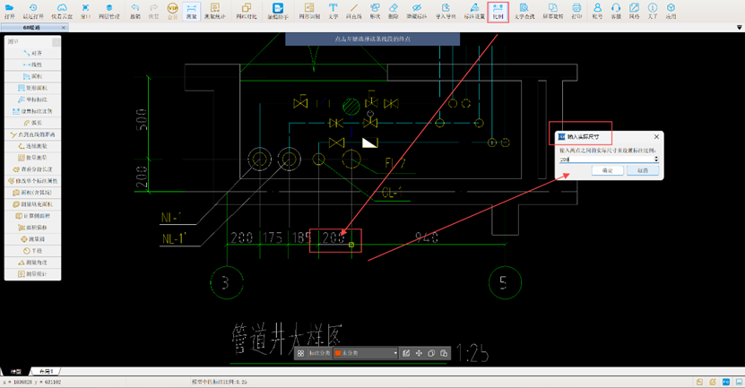 3. 以DN25的供、回水管工程量计算为例,首先测量管道井大样图中的回水管。由于大样图比例为1:25,需使用CAD快速看图功能中的【比例】功能,任意量取一段距离并输入实际尺寸,以便后续测量。