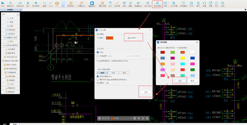 4. 因供水管和回水管需分开计算,可通过【标注设置】功能改变颜色以区分两种水管,此处用橙色表示供水管,黄色表示回水管。