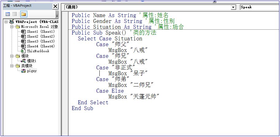 代码解析:在上面的类模块代码中,我们分别设置了三个属性:Name,Gender,Situation分别代表姓名,性别,场合;一个方法:Speak,这个方法中,我们只分了四种场合,如果不是以下的这四种场合:师父对pigsy的场合,师兄对pigsy的场合,师弟对pigsy的场合,非正式对pigsy的场合,我们将称呼他"天蓬元帅"。