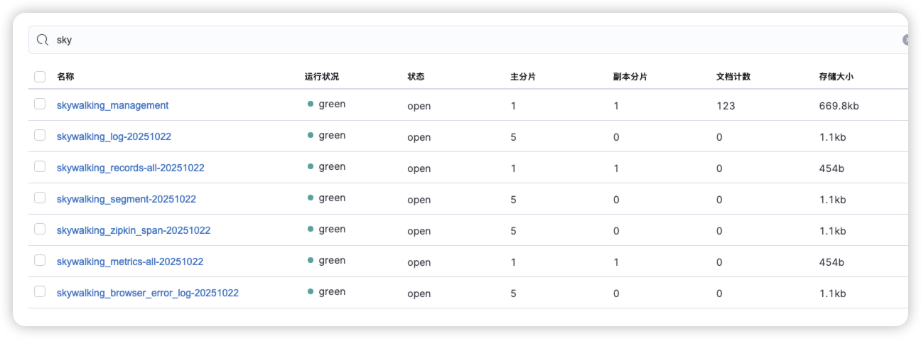 storage:selector: ${SW_STORAGE:elasticsearch} # 使用elasticsearch存储elasticsearch:namespace: ${SW_NAMESPACE:"skywalking"} # es命名空间clusterNodes: ${SW_STORAGE_ES_CLUSTER_NODES:192.168.1.99:9201,192.168.1.99:9202,192.168.1.99:9203} #es连接地址.......user: ${SW_ES_USER:"elastic"} #es账号password: ${SW_ES_PASSWORD:"123456"} #es密码.........