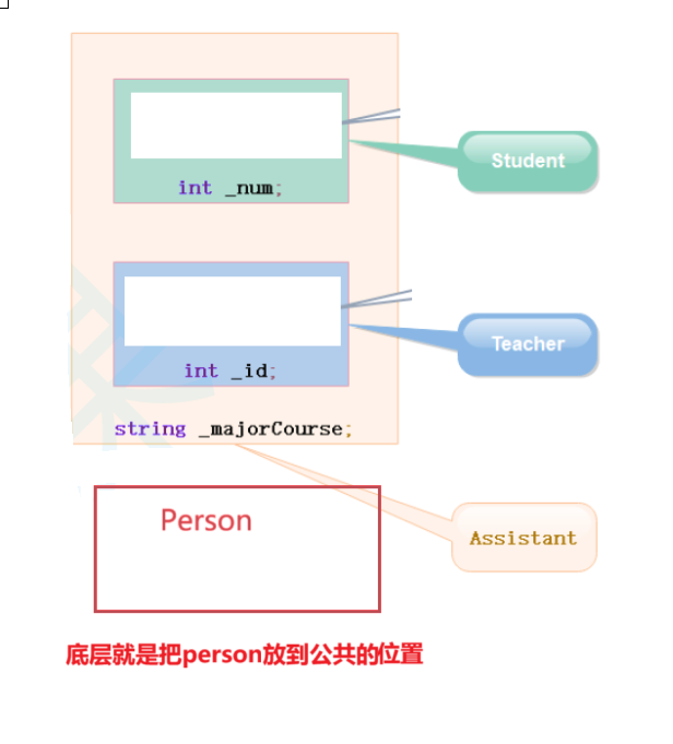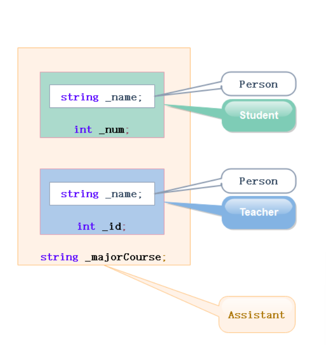 {// 编译报错:error C2385: 对“_name”的访问不明确 Assistant a;a._name = "peter";// 需要显⽰指定访问哪个基类的成员可以解决⼆义性问题,但是数据冗余问题⽆法解决 a.Student::_name = "xxx";a.Teacher::_name = "yyy";return 0;