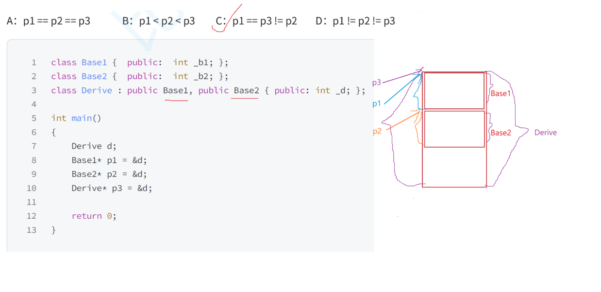 p3指向的是整个对象 Base1在Base2前面是因为,先继承的在前面,后继承的在后面