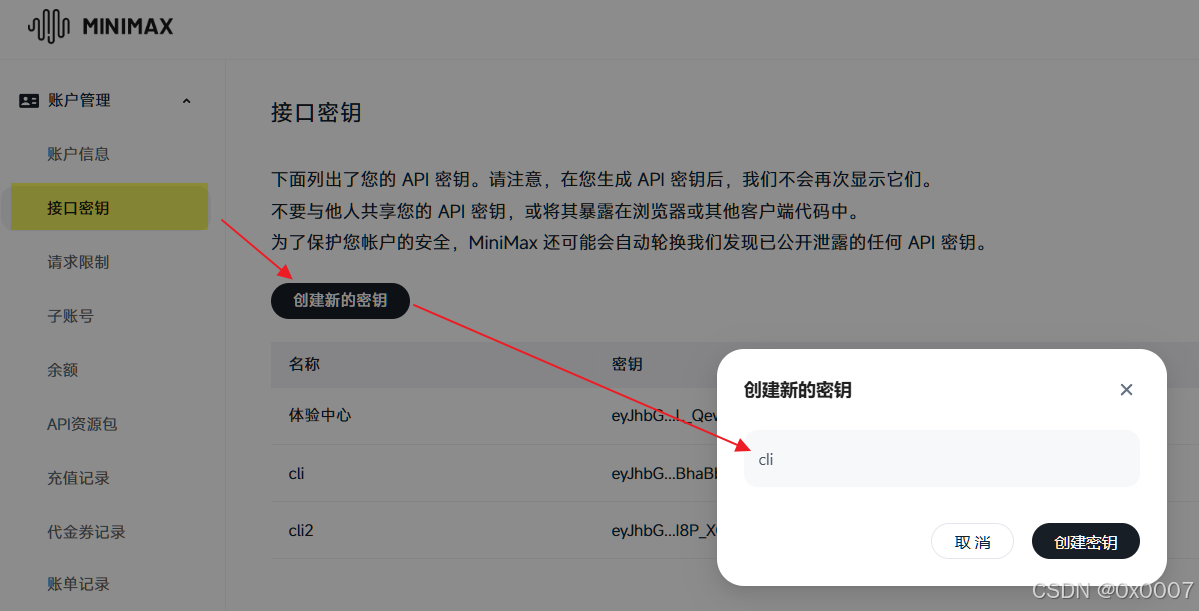 点击创建密钥按钮后,会立即显示新的密钥,这个密钥一定记好,因为后续就没办法看到完整的密钥了(至少我没找到)。