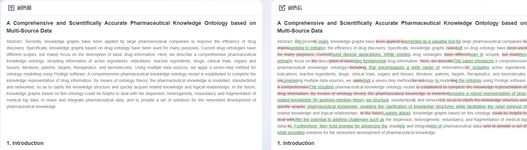 同时,它支持多轮润色对比,清晰展示修改痕迹,让科研人员在理解中提升写作水平。