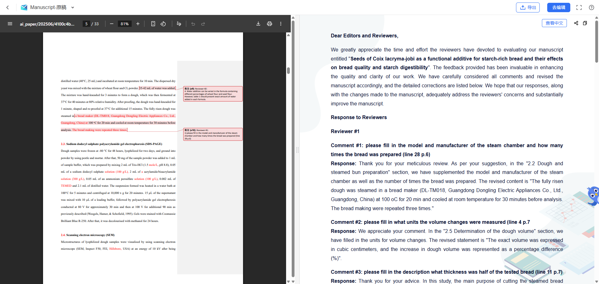 论文投稿后遇到审稿意见,往往让人头大。MedPeer的审稿回复工具能自动解析审稿意见,识别已修改与未修改内容,生成符合期刊格式的中英文回复信。
