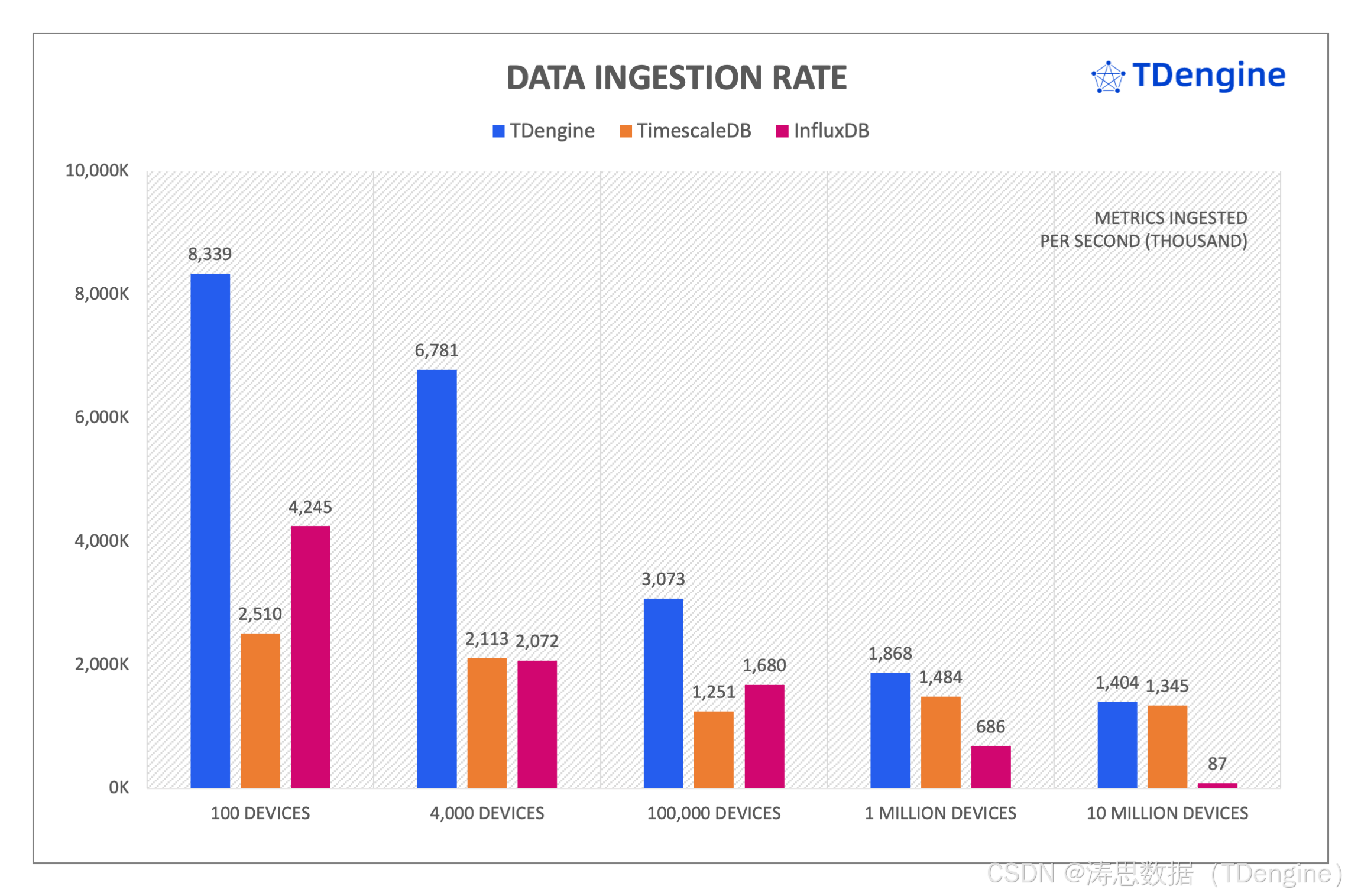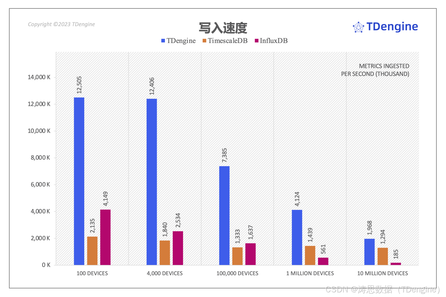 TSBS(Time Series Benchmark Suite)是国际公认的时序数据库性能测评标准,通过模拟真实场景的数据模型与查询模式,从写入、查询、存储、资源占用等维度全面评估数据库性能。TDengine 3.0 在 TSBS 的 IoT 和 DevOps 场景测试中均表现优异,下文将重点解读两大场景的测试结果。