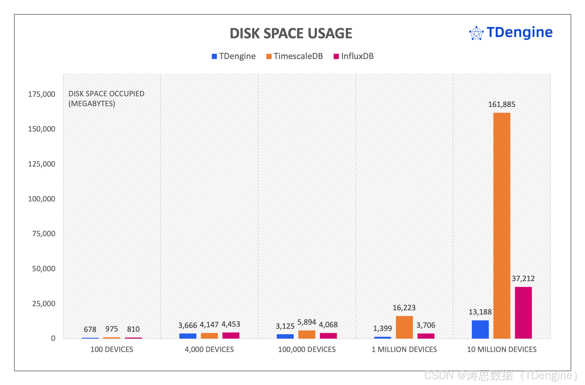 磁盘空间占用方面,TimescaleDB 在所有五个场景下数据规模均显著地大于 InfluxDB 和 TDengine,并且这种差距随着数据规模增加快速变大。TimescaleDB 在场景四和场景五中占用磁盘空间是 TDengine 的 11.6 倍和 12.2 倍。在前面三个场景中,InfluxDB 落盘后数据文件规模与 TDengine 非常接近,但是在大数据规模的场景四和场景五中,InfluxDB 落盘后文件占用的磁盘空间是 TDengine 的 2.6 倍和 2.8 倍。