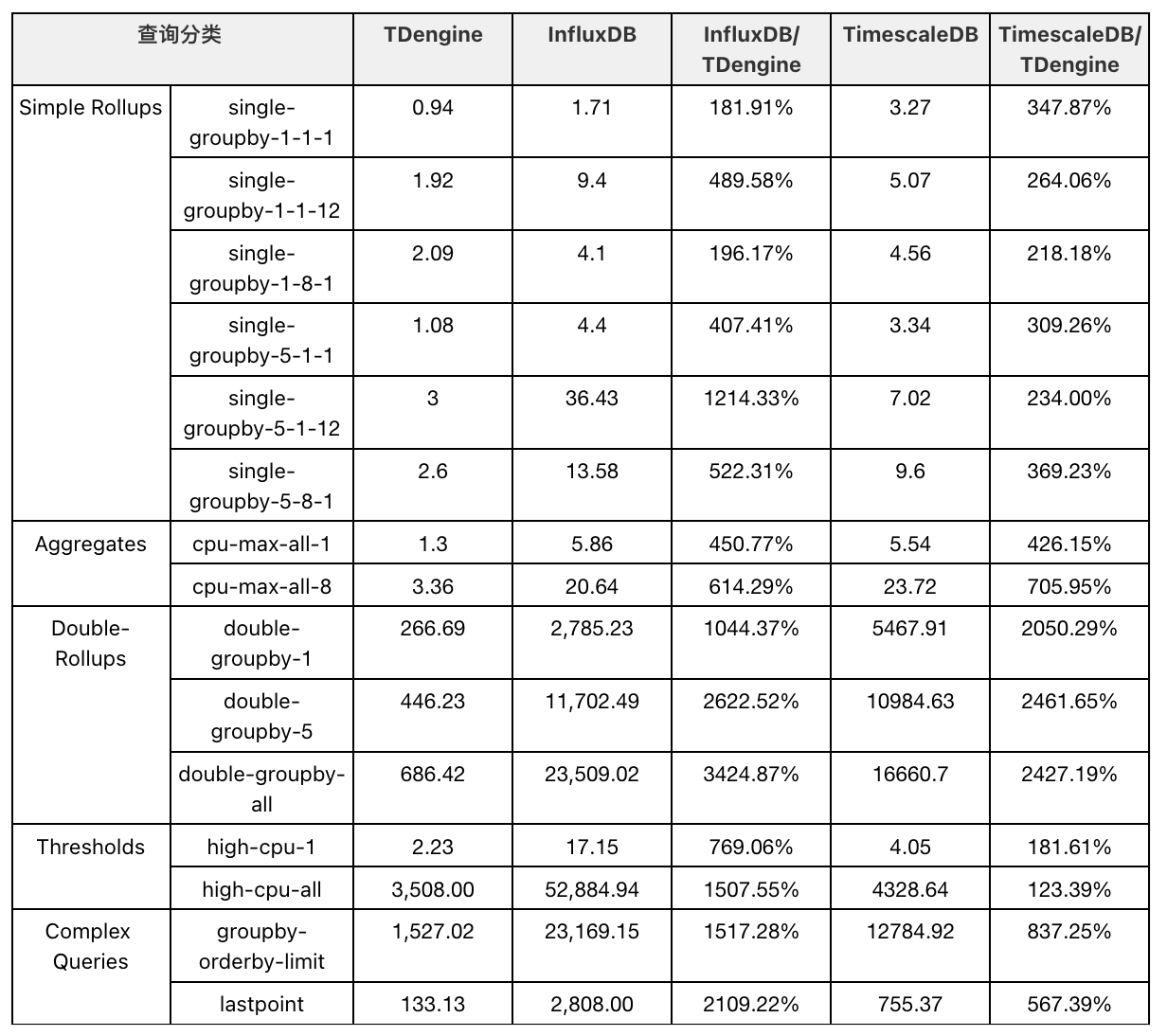 查询方面,在场景一(只包含 4 天的数据)与场景二的 15 个不同类型的查询中,TDengine 的查询平均响应时间全面优于 InfluxDB 和 TimescaleDB,而且在复杂查询上优势更为明显,同时具有最小的计算资源开销。相对于 InfluxDB,场景一,TDengine查询性能是其 1.9 ~ 37.0 倍,平均 11.3 倍,场景二,TDengine 查询性能是其 1.8 ~ 34.2 倍,平均是 11.3 倍。相对于 TimeScaleDB,场景一,TDengine 查询性能是其 1.1 ~ 28.6 倍,平均 7.6 倍,场景二,TDengine查询性能是其 1.2 ~ 24.6 倍,平均 7.7 倍。